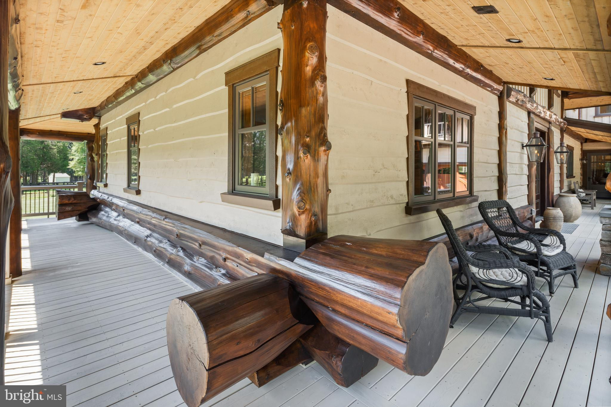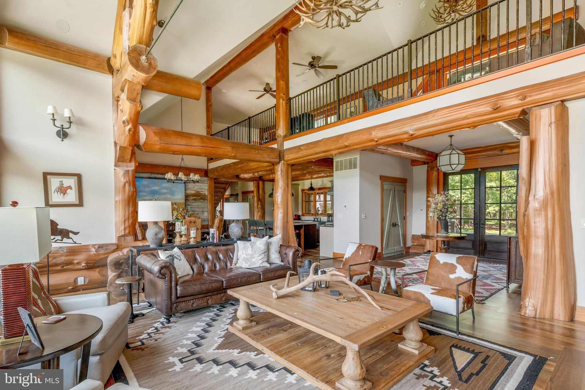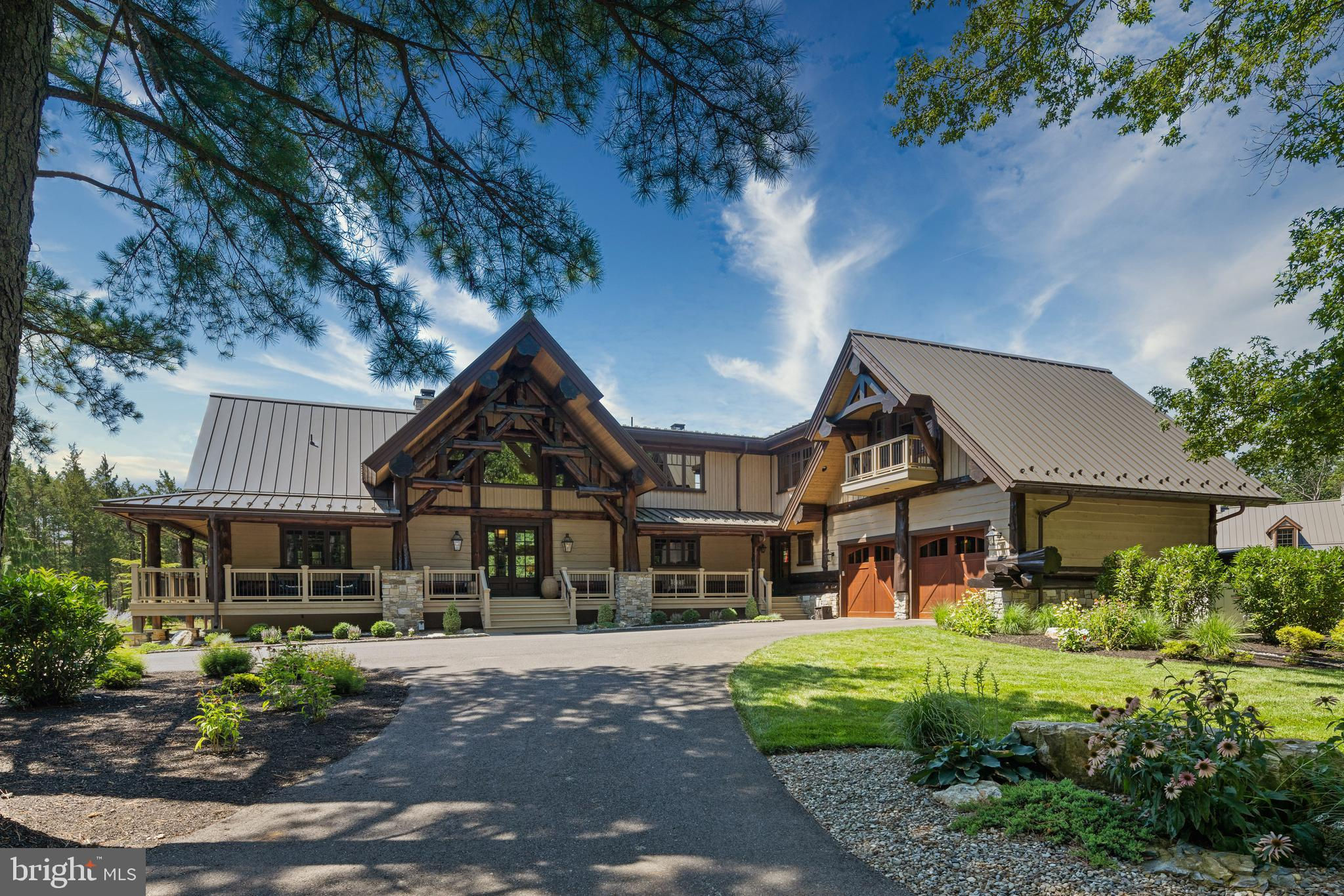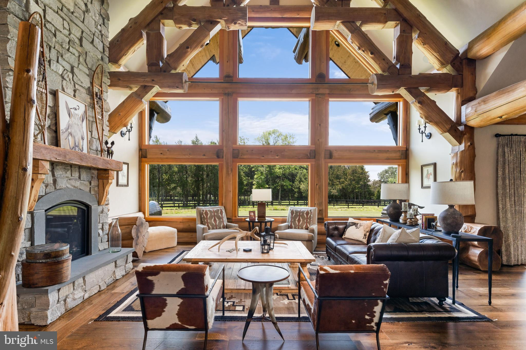 Extraordinary, one-of-a-kind, handcrafted, hybrid-fusion log home that was custom built with Western Red Cedar logs from British Columbia. Low taxes. This pristine and private retreat is unparalleled in architecture and quality craftsmanship with cedar timbers, decking and siding with standing seam metal roof systems, copper gutters and snow guards. Stone foundation and chimneys with blue stone caps. Handmade, Amish-built, solid doors with Ashley Norton hardware throughout. The meandering drive leads to your own slice of heaven, set back on 31 acres of pure tranquility. Whether you're looking for a country retreat or an equestrian paradise, this property will be sure to suit all of your needs. A covered front porch and entryway flanked by gas lanterns invites you into a gorgeous reception area, paneled in 200-year-old reclaimed barn boards. The dramatic great room boasts an A-frame wall of windows, a floor-to-ceiling stone fireplace and English oak wood floors. Rich in natural elements, textures inherent in the logs, the house provides great scale and livability with an open-concept floor plan for daily living and entertaining. The gourmet kitchen features subway tile, Blue Star gas range with a custom-made ventilation hood, pot filler, leathered granite countertops, Quartz-topped island, Thermador refrigeration, farmhouse sink, cabinetry by StarMark and a walk-in pantry. Fantastic integration of indoor and outdoor spaces that flow seamlessly. Access a lovely veranda from the main entertaining area to enjoy the outdoor stone, wood-burning fireplace and hot tub as you overlook the expansive backyard and pastures. The first-floor main bedroom suite with French doors to a covered porch, an exquisite master bathroom with Carrara marble, an oversized seamless glass rainfall shower, polished nickel fixtures, cast iron footed soaking tub, double vanity and a walk-in closet with custom built-ins. The main level also offers a guest suite/home office with Hunter Douglas electric shades, access to the rear deck and an additional full bathroom. The laundry room is outfitted with storage, leathered granite countertops, tile backsplash, Shaws Original farmhouse sink; access to the front porch and oversized, climate controlled two-car garage with commercial-grade epoxy floors, custom cedar garage doors. A stunning stairwell with a custom hand-hammered wrought-iron railing leads to the upper level with a fabulous loft lounge area that overlooks the great room, three spacious bedrooms with custom closet organization systems and balconies. A full bathroom finished in polished hexagonal tile, tub/shower and marble top vanity. The finished lower level offers a second kitchen with Thermador steam oven, island with reclaimed barn boards and leathered granite. TV/media room w/ barn board walls. A gym with walkout access, a full bath with oversized steam shower, double vanity with marble top and tile backsplash. A second laundry room and storage. Lovely picturesque Amish built post & beam barn w/ standing-seam metal roof and copper gutters. Featuring 5 oversized stalls with rubber mats, fans, cameras to monitor horses, center aisle with pavers, wash stall, tack room with lockers, kitchenette with full-sized refrigerator, sink, dishwasher, stone countertops, epoxy floors. A guest suite and full bathroom with seamless glass shower. The upper level offers an expansive loft space for entertaining. All aluminum-clad casement windows throughout, vintage water hydrants, a separate well for barn, wi-fi irrigation, Sonos sound system, 100 Amp sub-panel. Round pen 60' , 5-6 turnouts, outdoor wash stall, wooded riding trails. 8 acres of fenced pastures w/ solar-powered electric fencing and water, riding ring 100' x 180' w/ irrigation system. Whole-house & barn generator. HVAC: 4 zones house, 1 zone barn. Smart switch exterior lighting. Exterior barn lights w/ timer. Central Vac, Cat 5 & cable throughout. Wi-fi irrigation lawn & beds. Farm Assessed.