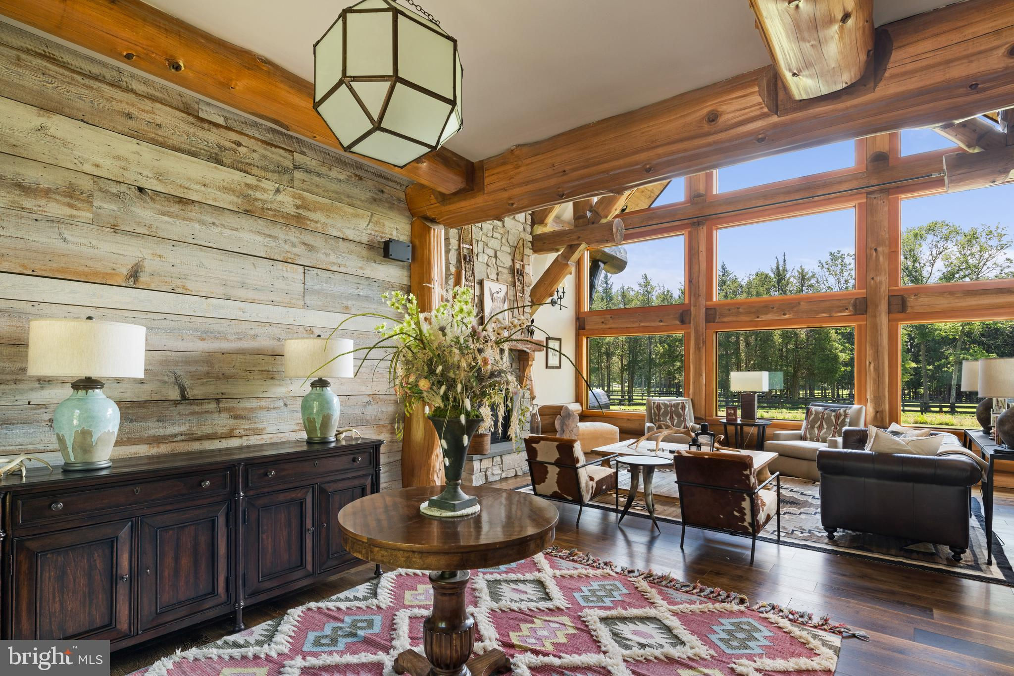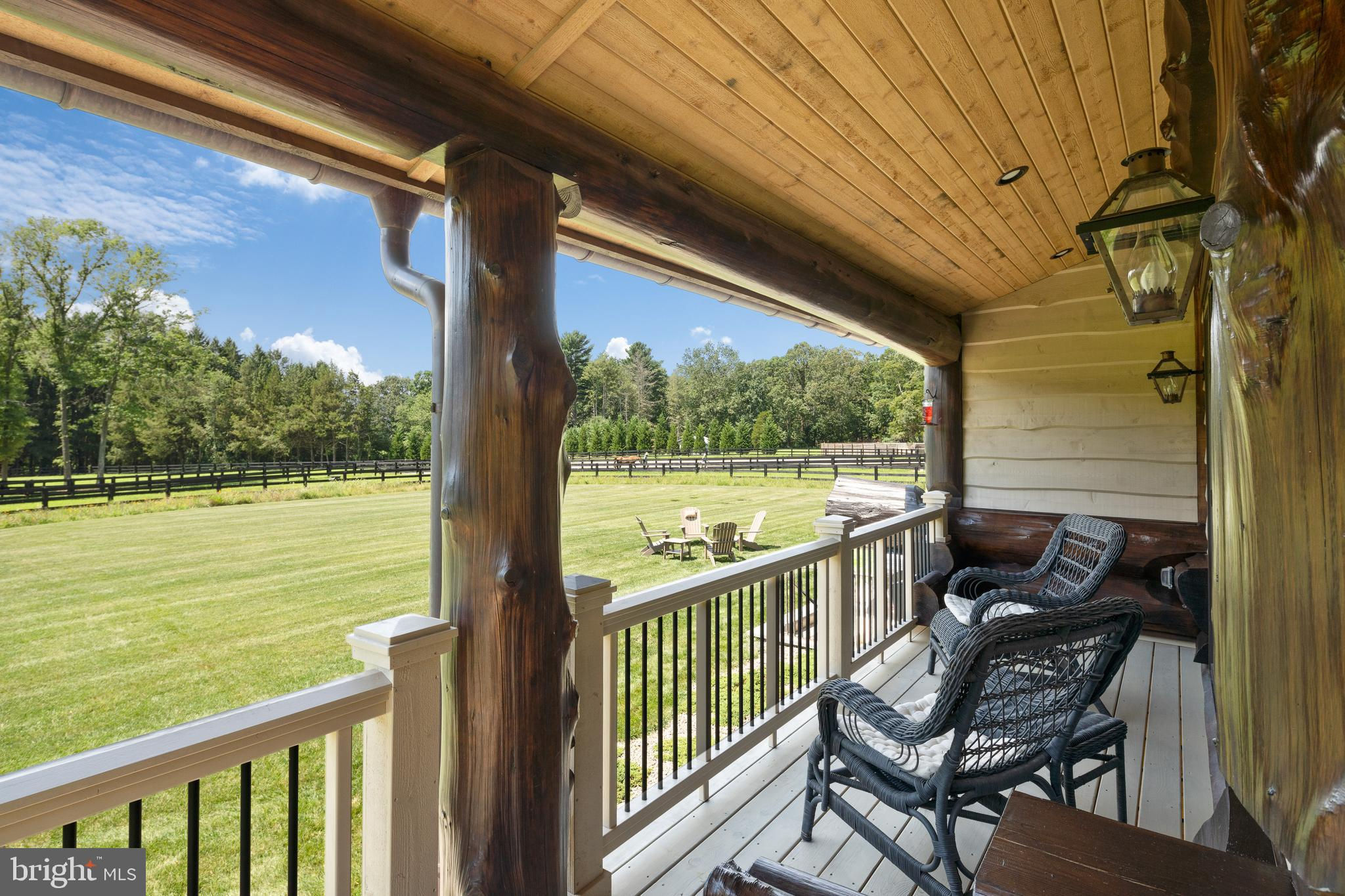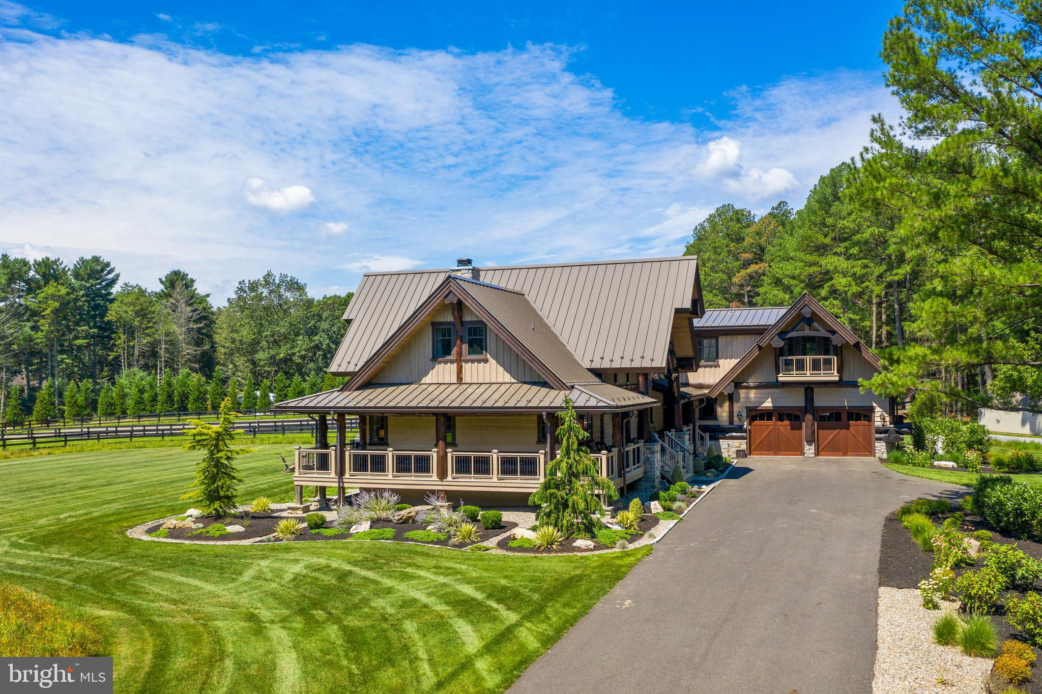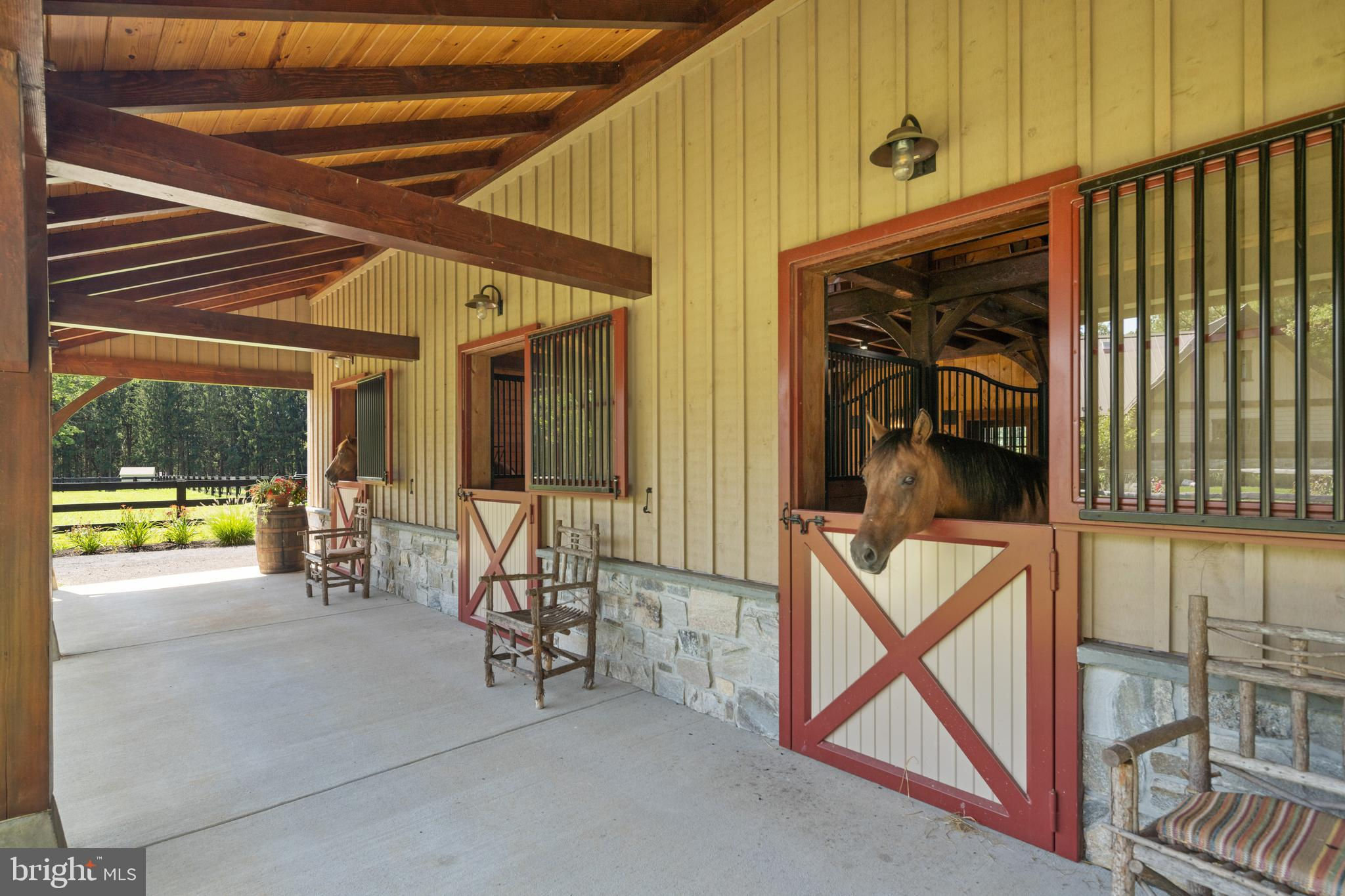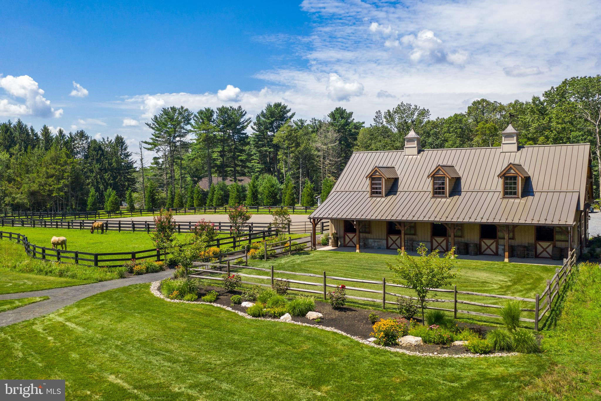 Extraordinary, one-of-a-kind, handcrafted, hybrid-fusion log home that was custom built with Western Red Cedar logs from British Columbia. Low taxes. This pristine and private retreat is unparalleled in architecture and quality craftsmanship with cedar timbers, decking and siding with standing seam metal roof systems, copper gutters and snow guards. Stone foundation and chimneys with blue stone caps. Handmade, Amish-built, solid doors with Ashley Norton hardware throughout. The meandering drive leads to your own slice of heaven, set back on 31 acres of pure tranquility. Whether you're looking for a country retreat or an equestrian paradise, this property will be sure to suit all of your needs. A covered front porch and entryway flanked by gas lanterns invites you into a gorgeous reception area, paneled in 200-year-old reclaimed barn boards. The dramatic great room boasts an A-frame wall of windows, a floor-to-ceiling stone fireplace and English oak wood floors. Rich in natural elements, textures inherent in the logs, the house provides great scale and livability with an open-concept floor plan for daily living and entertaining. The gourmet kitchen features subway tile, Blue Star gas range with a custom-made ventilation hood, pot filler, leathered granite countertops, Quartz-topped island, Thermador refrigeration, farmhouse sink, cabinetry by StarMark and a walk-in pantry. Fantastic integration of indoor and outdoor spaces that flow seamlessly. Access a lovely veranda from the main entertaining area to enjoy the outdoor stone, wood-burning fireplace and hot tub as you overlook the expansive backyard and pastures. The first-floor main bedroom suite with French doors to a covered porch, an exquisite master bathroom with Carrara marble, an oversized seamless glass rainfall shower, polished nickel fixtures, cast iron footed soaking tub, double vanity and a walk-in closet with custom built-ins. The main level also offers a guest suite/home office with Hunter Douglas electric shades, access to the rear deck and an additional full bathroom. The laundry room is outfitted with storage, leathered granite countertops, tile backsplash, Shaws Original farmhouse sink; access to the front porch and oversized, climate controlled two-car garage with commercial-grade epoxy floors, custom cedar garage doors. A stunning stairwell with a custom hand-hammered wrought-iron railing leads to the upper level with a fabulous loft lounge area that overlooks the great room, three spacious bedrooms with custom closet organization systems and balconies. A full bathroom finished in polished hexagonal tile, tub/shower and marble top vanity. The finished lower level offers a second kitchen with Thermador steam oven, island with reclaimed barn boards and leathered granite. TV/media room w/ barn board walls. A gym with walkout access, a full bath with oversized steam shower, double vanity with marble top and tile backsplash. A second laundry room and storage. Lovely picturesque Amish built post & beam barn w/ standing-seam metal roof and copper gutters. Featuring 5 oversized stalls with rubber mats, fans, cameras to monitor horses, center aisle with pavers, wash stall, tack room with lockers, kitchenette with full-sized refrigerator, sink, dishwasher, stone countertops, epoxy floors. A guest suite and full bathroom with seamless glass shower. The upper level offers an expansive loft space for entertaining. All aluminum-clad casement windows throughout, vintage water hydrants, a separate well for barn, wi-fi irrigation, Sonos sound system, 100 Amp sub-panel. Round pen 60' , 5-6 turnouts, outdoor wash stall, wooded riding trails. 8 acres of fenced pastures w/ solar-powered electric fencing and water, riding ring 100' x 180' w/ irrigation system. Whole-house & barn generator. HVAC: 4 zones house, 1 zone barn. Smart switch exterior lighting. Exterior barn lights w/ timer. Central Vac, Cat 5 & cable throughout. Wi-fi irrigation lawn & beds. Farm Assessed.