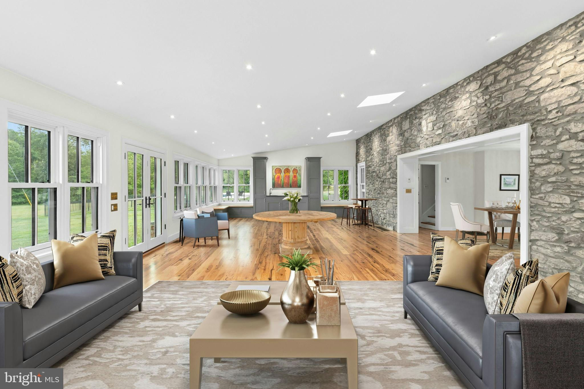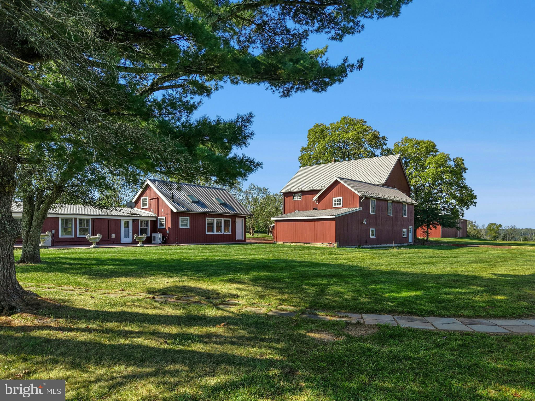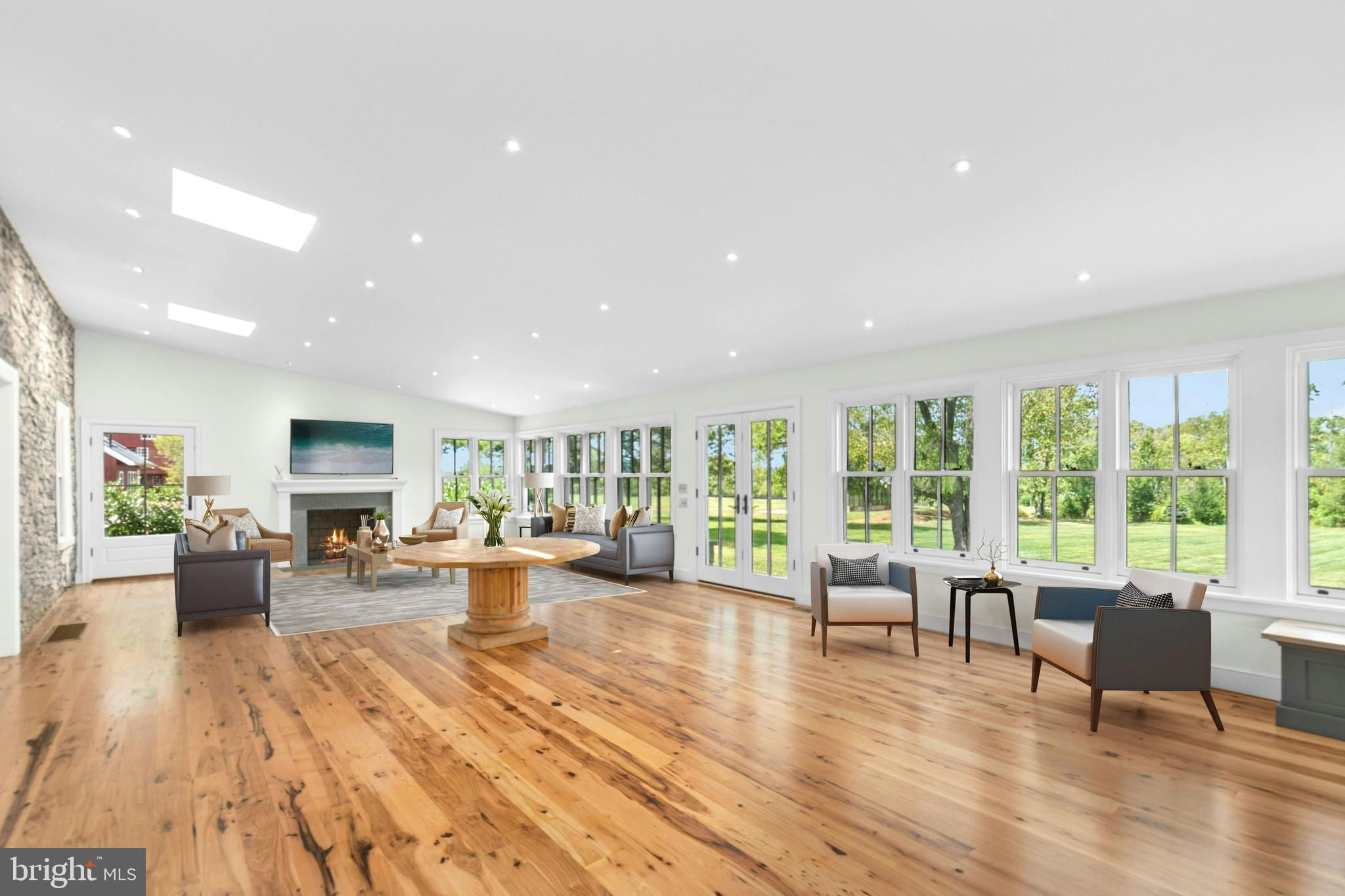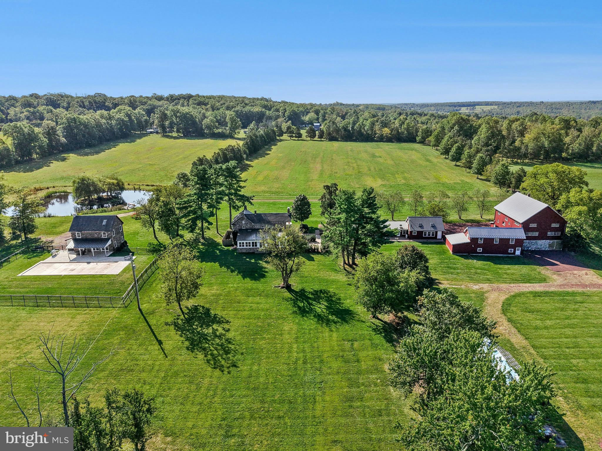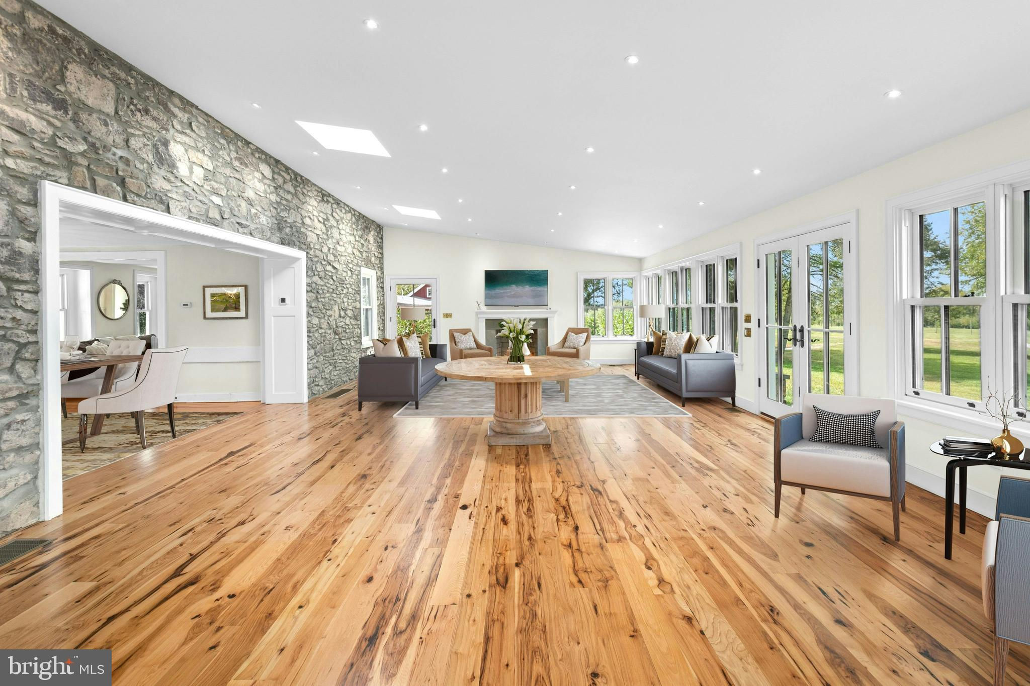BUCKS COUNTY FARMHOUSES are defined by their settings and their position on their acreage, overlooking their fields and pastures, with long driveways leading past bank barns and farm buildings. Wheaton Fields Farm is one of the finest examples of these storied properties, boasting 50 ACRES OF WOODS, FIELDS, PASTURES and even an ORCHARD WITH GREENHOUSE. At Wheaton Fields, approach to the cluster of picturesque farm buildings is down a quarter mile drive, nicely removed from a quiet country road. The quintessential 1800’s POINTED STONE COLONIAL, with rocking chair front porch, has been RENOVATED AND ENHANCED. A 2024 GREAT ROOM ADDITION has three WALLS OF GLASS, an EXPOSED STONE WALL, WET BAR, SKYLIGHTS and FIREPLACE, all opening to the sandstone patio with LONG DISTANCE VIEWS over the acreage and beyond. Pine, hickory and tile floors span both levels of the home. Throughout, 3 fireplaces, mullioned glass windows with DEEP WINDOWSILLS and PERIOD HARDWARE attest to the classic Bucks County farmhouse character. Completing the first floor is a cozy living room with fireplace, dining room and charming country kitchen. On the second floor, there is an open and airy primary suite, bath and two additional bedrooms. Outside, there are multiple buildings that have been cleverly converted into areas for guests, family, or hobbies. A picture-perfect 2017 POOL HOUSE was designed to complete the original farmhouse with its own stone exterior. The stunning kitchen and great room with radiant heated floor opening to a covered patio and heated saltwater pool overlooking the orchard and greenhouse. Upstairs, a full bath and two additional studio rooms make this an ideal space for visitors. Nearby, one of the original farm buildings now boasts 3 CHARMING COTTAGE SPACES, 2.5 baths, as well as a family room, kitchen and laundry facilities. The ORIGINAL THREE STORY BANK BARN includes a wing that has been CONVERTED INTO A STUDIO, with bath and kitchenette. The 2015 POLE BARN will store every toy and farm essential and has solar panels sufficient to run the whole property. The PRIVATE POND AND DOCK beckon an afternoon on the water. Finally, there is a greenhouse and a fenced orchard with mature apple, pear, peach and plum trees. This SOLAR POWERED PROPERTY WITH GENERATOR lets you relax and invite a crowd for summer weekends, winter escapes, and every holiday. Whether a full-time residence or a weekend retreat, special occasions and other outside events will be celebrated here with joy. The views from the porch and patios provide an ever-changing panorama of seasonal colors and simple evening relaxation under the stars. Wheaton Fields is the perfect farm property, enhanced by elements from a bygone era and nestled in a secluded Bucks County setting. This clever design allows for use as a FAMILY COMPOUND OR FOR MULTI-GENERATIONAL LIVING. This private paradise loses touch with the world just over the hills, yet is still within easy driving distance to magic weekends of Bucks County dining, antiquing and recreation. Estate appraisal of $3,150,000 available. Additional 6.7 Ac wooded lot available.