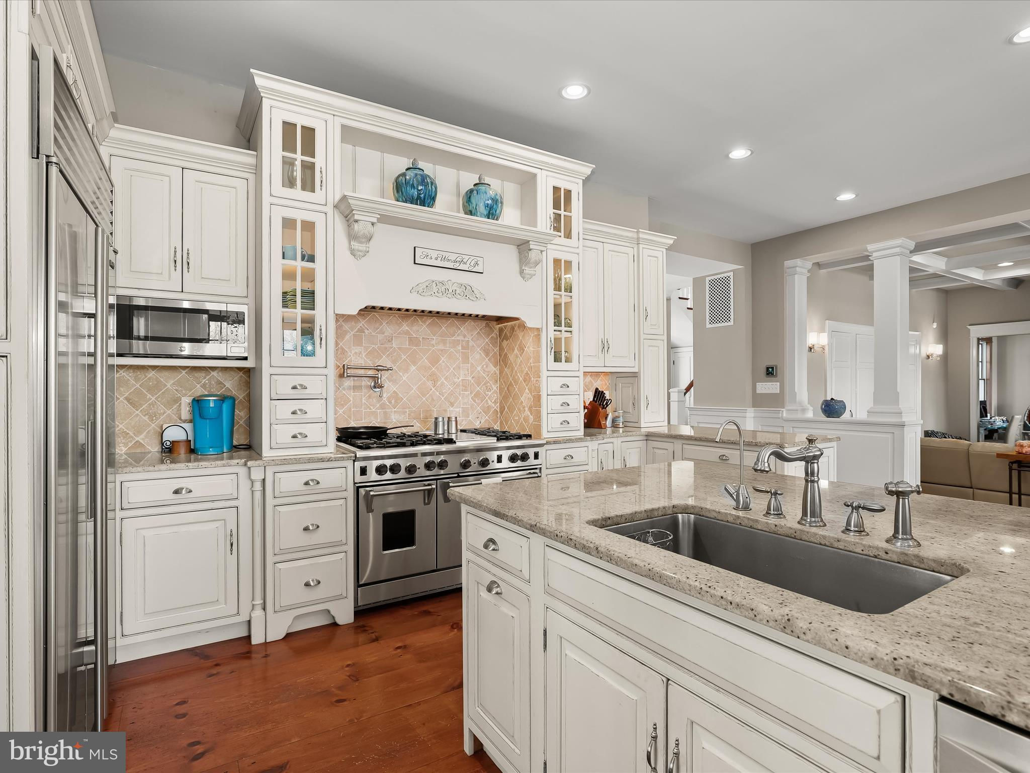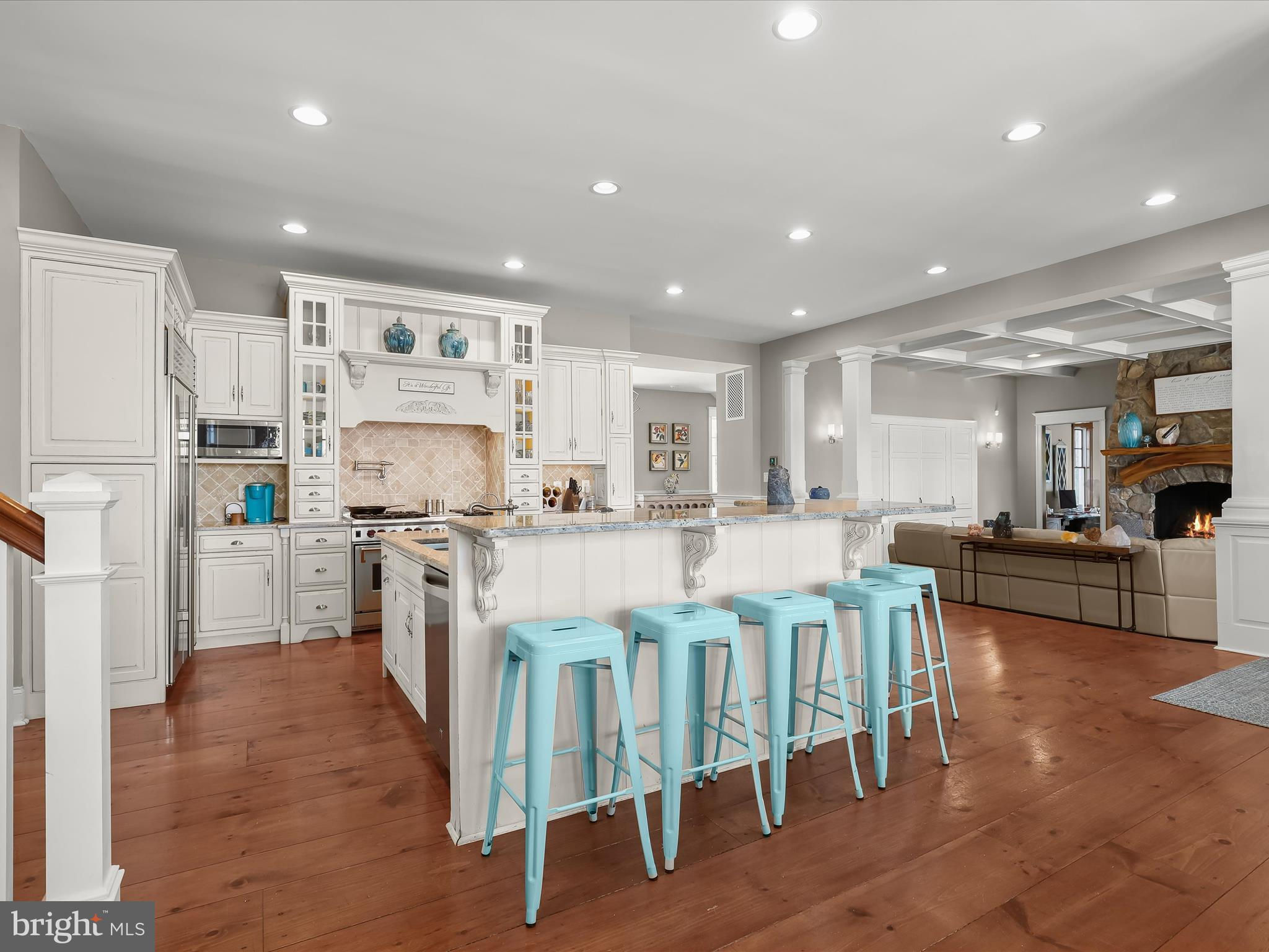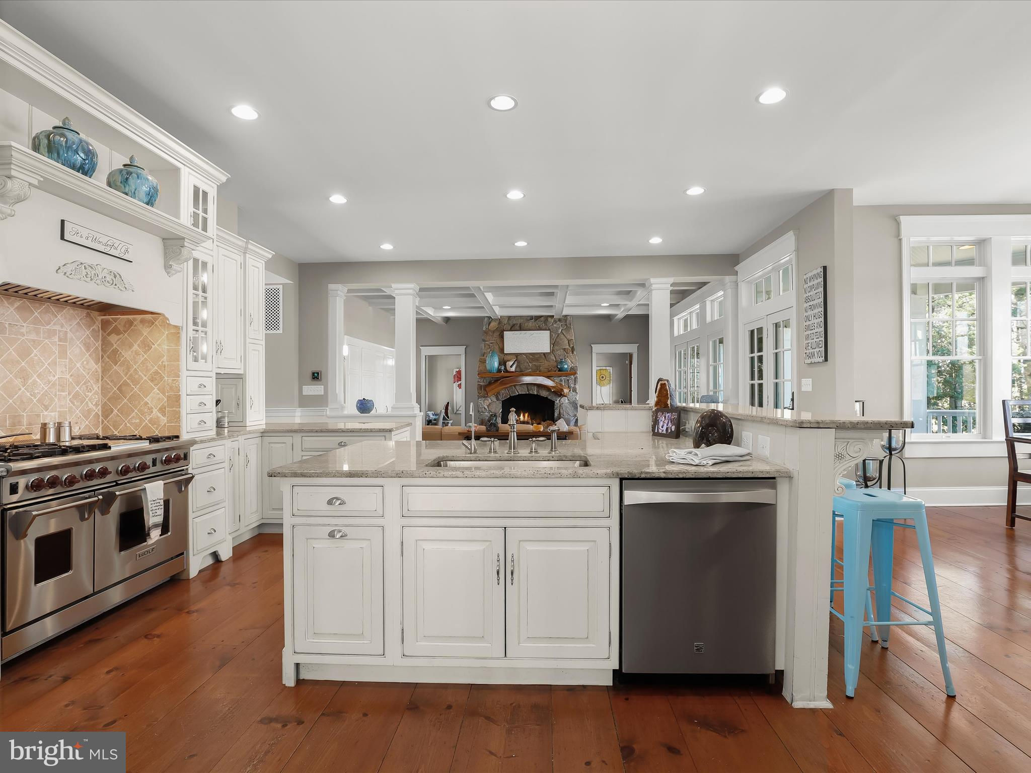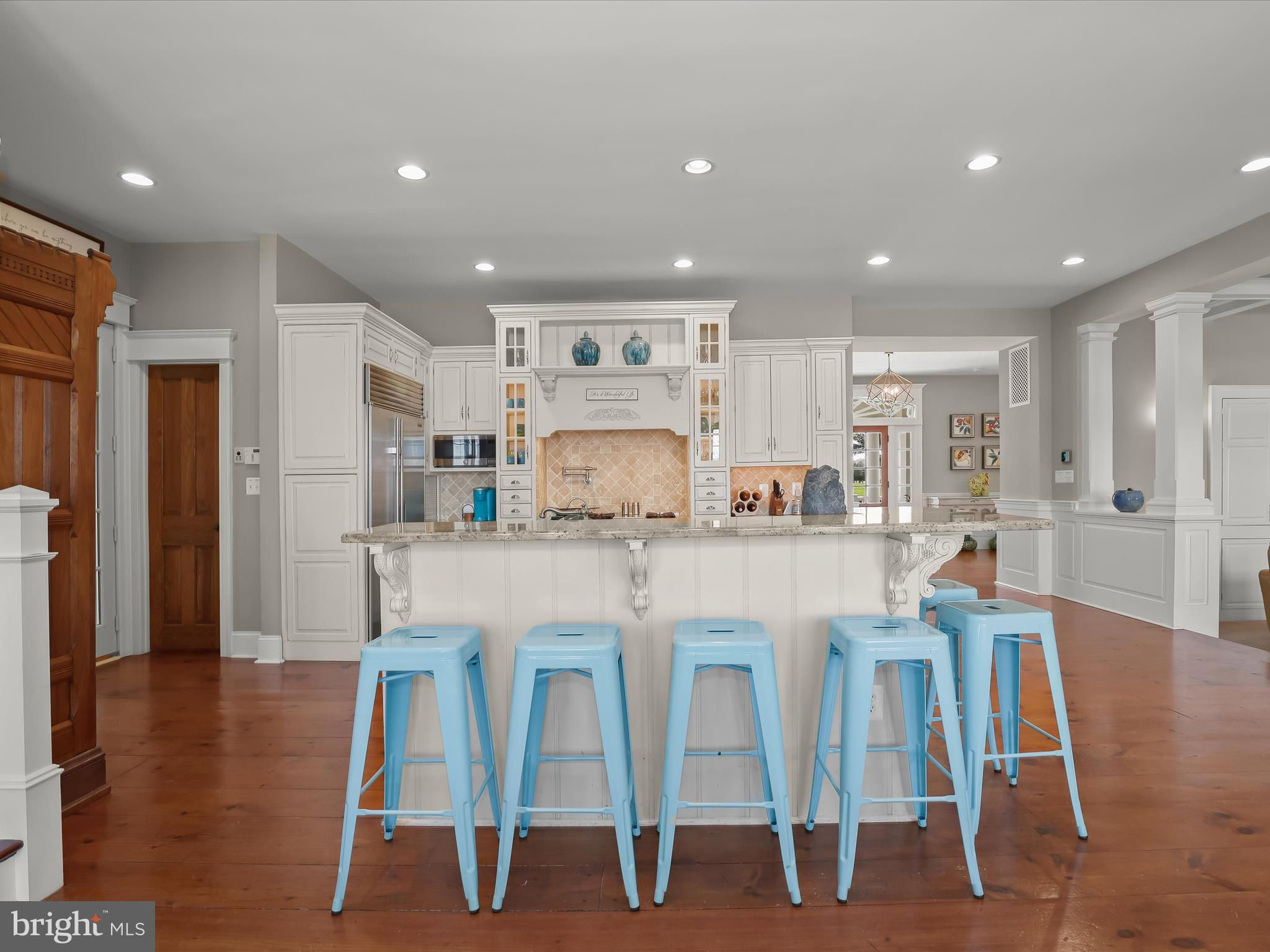 Experience unparalleled waterfront living in this stunning Coastal Farmhouse situated on 13.2 private acres in the desirable Kennersley Farm community. Custom-built as a former builder’s residence, this home showcases the highest quality materials and exceptional craftsmanship throughout. With 8 bedrooms and 6 full baths in the main house, plus a charming 2-bedroom Carriage House with a full kitchen and bath, this estate offers expansive space for family and guests to gather. The detached stone carriage house is located over a 2-car side-loading garage with a conditioned work/storage room. Step inside the main house to find meticulously designed interiors featuring low-maintenance hewn pine hardwood floors, 8-inch wood base, solid wood doors, and raised wood panel wainscoting. The waterside family room is a true showstopper with a coffered ceiling, stone fireplace, a designer mantle, built-in media, and panoramic views. Entertain effortlessly in the central gourmet kitchen with waterside access or enjoy vibrant indoor games in the oversized adjacent recreation room. Later, a quiet vibe will draw you to unwind in the main-level ensuite with an attached sunroom offering access to a serene side deck for a good read or morning coffee. With thoughtful design and attention to comfort and convenience, this home includes both main-level and upper-level laundry rooms, a finished attic bonus bedroom with a sitting area and a half bath, and endless customization possibilities for a future expansion in the unfinished basement with an exterior door and walk-up stair. Outdoor living is paramount with 450 feet of private navigable waterfront along Southeast Creek and views of the Chester River. A private dock equipped with water, electric service, 2 slips, and 2 ski lifts makes boating fun and accessible. Enjoy summer days by the waterside saltwater pool, complete with a paver patio, diving rock, and a 10-foot diving well. Evenings can be spent by the waterside stone fire pit or on the tiered covered porch and upper balcony overlooking the water. Nature enthusiasts will appreciate the natural shoreline, kayak launch, mature trees, and the presence of mated bald eagles. Professional landscaping and outdoor lighting enhance the estate’s beauty, while a private lane with a security alarm ensures seclusion. Perfectly situated near Kennersley Point Marina and other nearby marinas, this location offers convenient access to Chestertown, Rock Hall, and Annapolis by boat, as well as MD 213, Rte-50, and Rte-301 by car. This fully furnished home is an entertainer's dream and a rare waterfront oasis—schedule your private tour today!