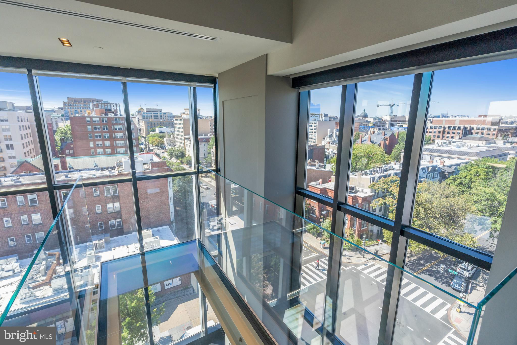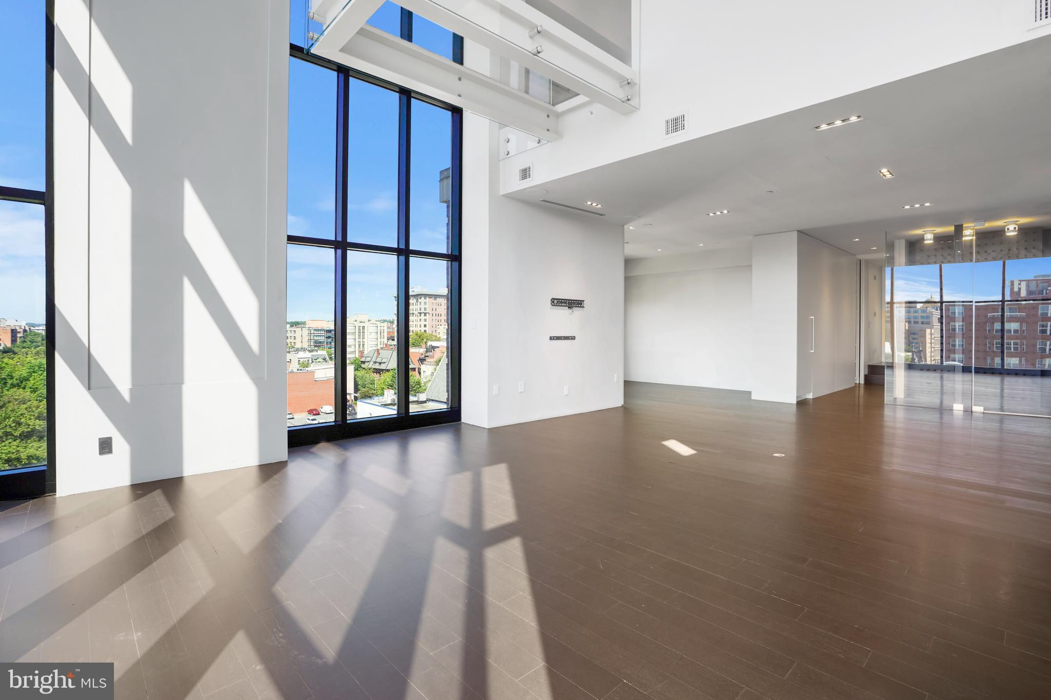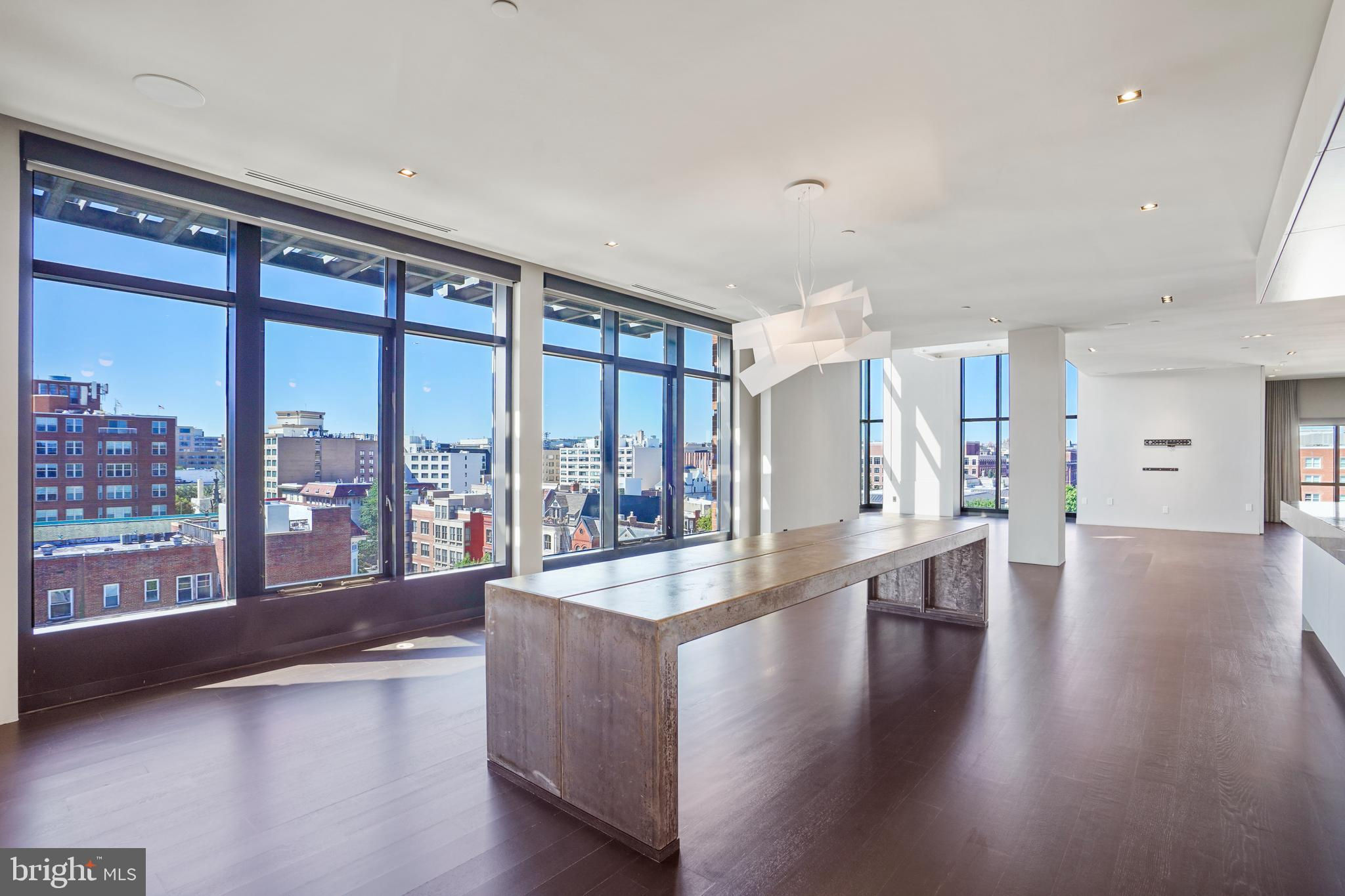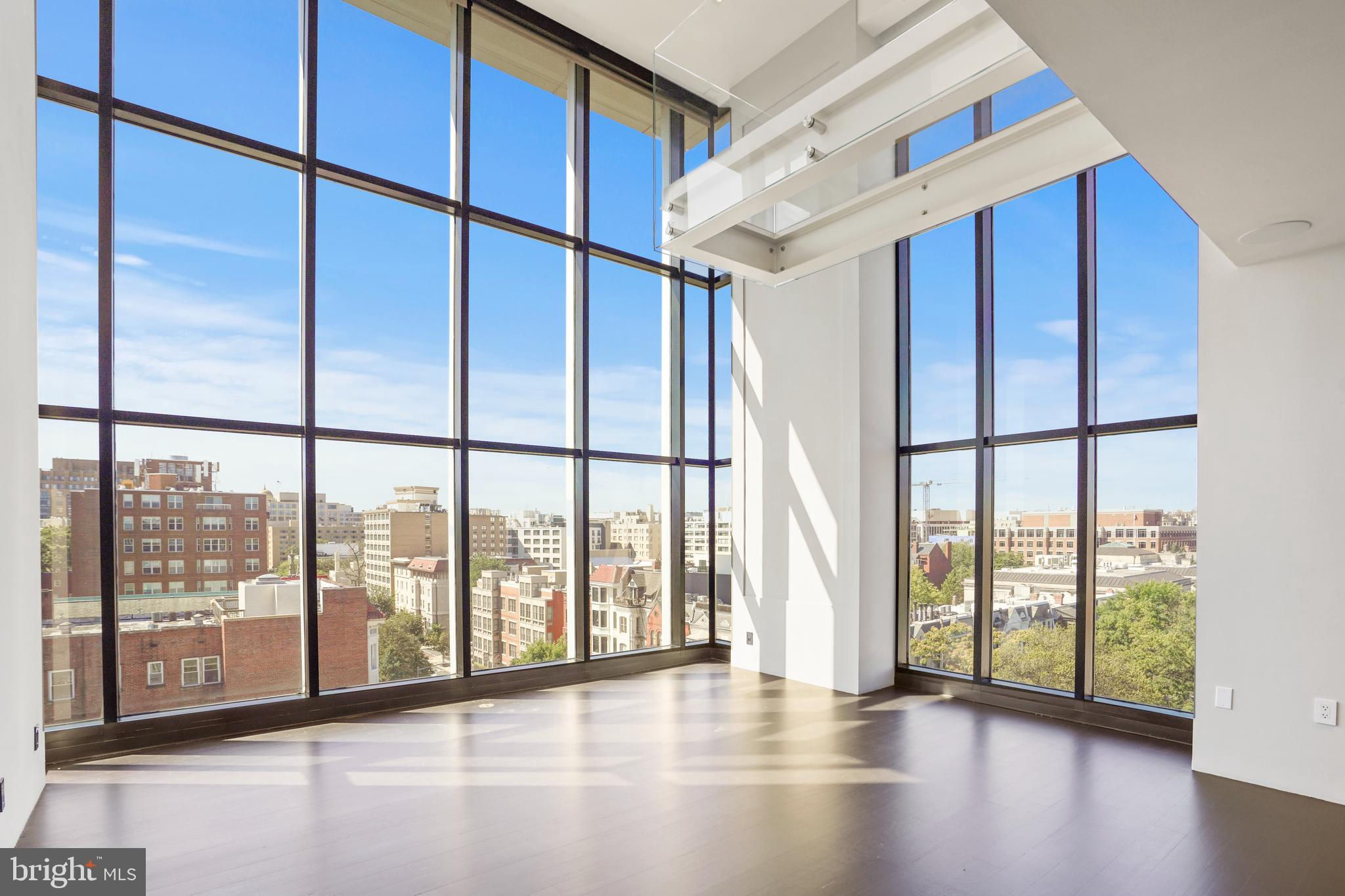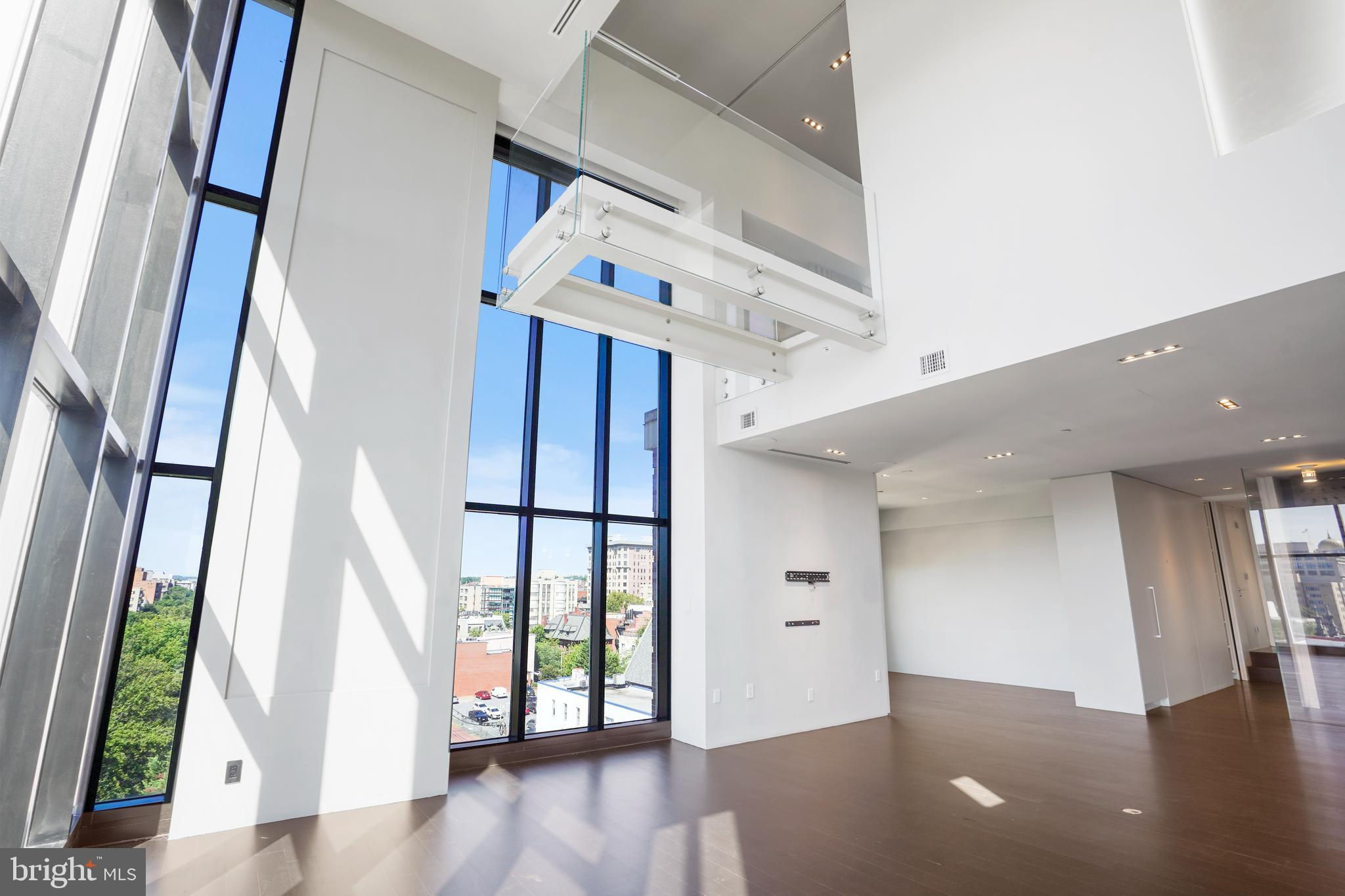 Located in the heart of Logan Circle just one block from bustling 14th Street this dramatic, premier 2 bedroom, 2 bathroom + DEN corner penthouse at the Metropole provides over 2,800 sqft of luxurious interior living space on two levels plus over 900 sqft of private outdoor terraces. Originally designed by architect Robert Gurney, the expansive main level with newly refinished hardwood floors throughout features an open living area with 21- foot high ceilings and spectacular floor-to-ceiling corner windows providing southern and western exposures for stunning sunsets and expansive city views. Open to the living area is a large and truly gourmet kitchen with high-end stainless- steel appliances including 2 wall ovens, 2 dishwashers, an extra-large Subzero refrigerator/freezer, gas cooktop, griddle and built-in deep fryer, an enormous amount of cabinet space and a 23-foot long island. Open to the kitchen is a stunning and spacious dining room with a wall of windows, a custom iron dining table, designer lighting fixture and a gas fireplace set within a built-in credenza with additional storage. A large den (with a window and closet) lies just beyond the main living area and can easily serve as a wonderful office space perfect to satisfy your work-at-home requirements. Next to the den is the second bedroom with custom murphy bed and built-ins and an adjacent marble Waterworks full bath with tub . Finally, on the main level is a stunning glass front temperature- controlled wine room and utility room with a brand new full-size washer/dryer. The second level leads to the private owners suite with a generously- sized bedroom featuring multiple windows for more spectacular views. An architectural feature, truly unique to the space, is a glass catwalk that juts out just beyond the bedroom overlooking the dramatic living space with its tremendous ceiling height, glass and views below. (Large pocket doors can close off the bedroom from the open area below) Flowing seamlessly and open to the bedroom is an elegant dressing area with plentiful closet space plus access to a large balcony. A marble Waterworks bathroom completes the luxurious experience of this perfect owners retreat. The second floor continues with a wet bar containing a dishwasher, wine fridge and storage cabinetry which is located conveniently before the entrance to a large private bi-level roof deck . Additional features of the unit include State-of-the-art technology with Control 4 system and automated Lutron solar shades on all windows. Three side-by-side garage parking spaces along with a large storage room are also included. The Metropole is a high -end boutique building providing an on-site concierge and outdoor common terrace space located just a few blocks from the Dupont Circle metro , one block from chic 14th St. with all of its shops, restaurants and the acclaimed Studio Theater and the gorgeous Logan Circle just another block away