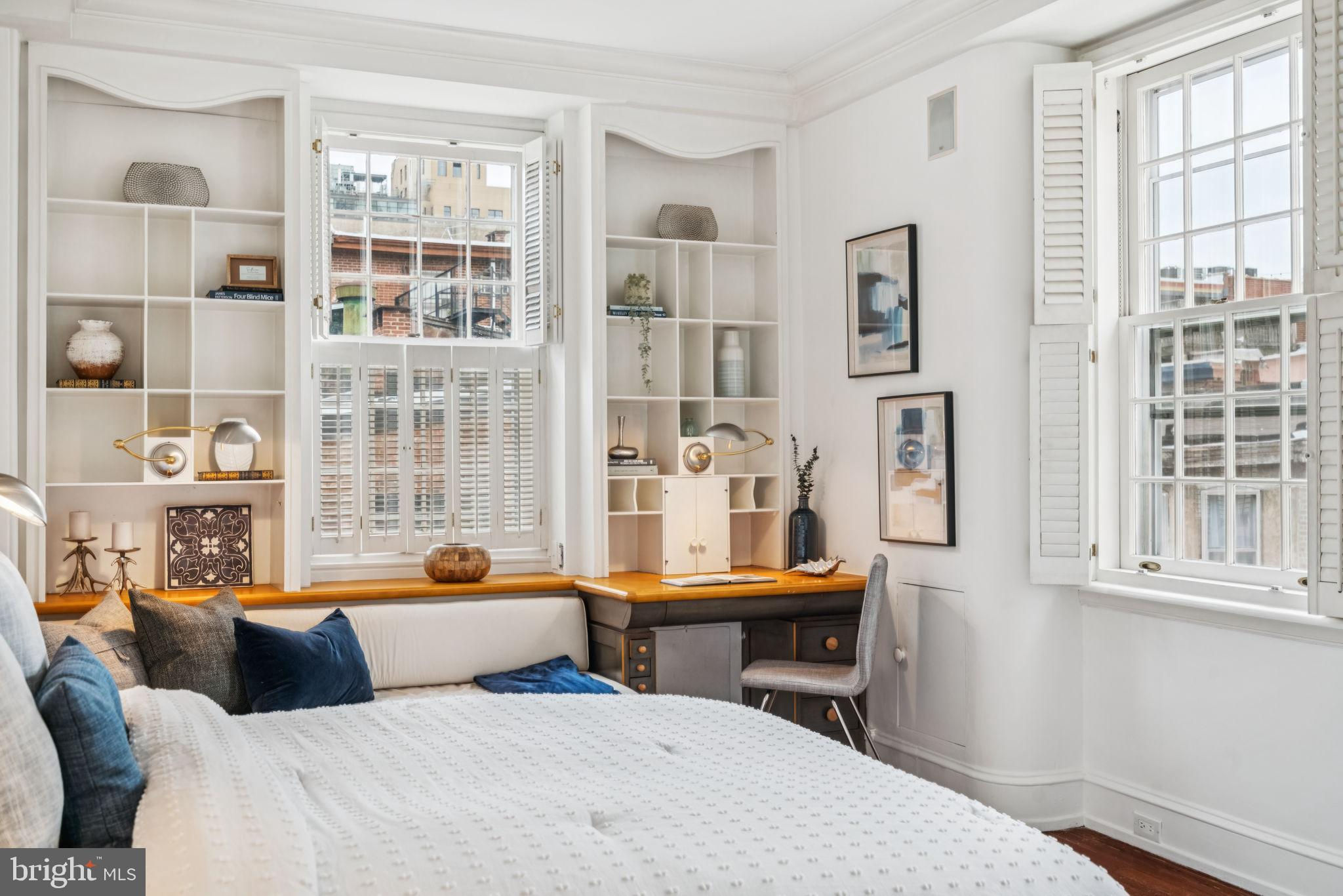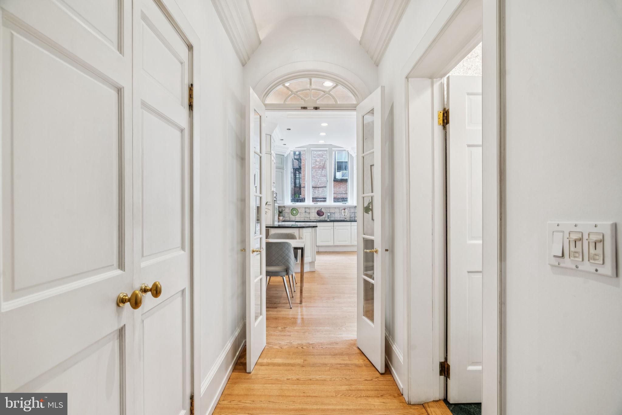 Welcome to 1818 Delancey Place—a magnificent 20-foot-wide historic residence with Garage Parking, nestled on one of Philadelphia’s most iconic and coveted blocks. Just one block from Rittenhouse Square, this elegant Federal-style home offers over 4,300 square feet of sun-drenched, beautifully proportioned living space, blending timeless architectural detail with modern comfort and flexibility. Enter through dual arched foyers and ascend two marble steps into a grand, light-filled formal dining room with soaring 12-foot ceilings, intricate crown moulding, and a stately original fireplace. A decorative niche provides the perfect spot to showcase artwork, creating a striking focal point. Custom inlaid flooring flows gracefully through the main level, visually connecting each space. A large archway leads to the refined living room at the front of the home, where tall windows overlook tree-lined Delancey Place and its distinguished facades, filling the space with natural light. Just off the dining room, French doors open to an intimate deck—also accessible from the spacious eat-in kitchen—perfect for morning coffee or evening cocktails. The expansive kitchen is anchored by a large, south-facing window that floods the space with natural light. With abundant cabinetry and generous proportions, it's ideal for designing your dream chef’s kitchen. A wide hallway connects the kitchen to the dining area and includes a coat closet, powder room, and access to the basement. The second floor features a sunlit, oversized library at the top of the stairs, complete with custom bookshelves, a wood-burning fireplace, and an adjacent wet bar—perfect for reading, relaxing, or entertaining. At the front of the home, the luxurious primary suite features high ceilings, tall windows, recessed lighting, and a decorative marble fireplace. Dual closets—including a walk-in—lead to the spacious en-suite bath, a marble-and-tile retreat with spa-like elegance. On the third floor, you’ll find two generously sized bedrooms with high ceilings, ample closet space, and en-suite baths. The front bedroom includes a private dressing room, while the rear bathroom exudes vintage charm with a clawfoot tub and beautiful tilework. The fourth floor offers a versatile front room with original random-width hardwood floors and a large skylight—perfect for a bedroom, studio, home office, or playroom. This level also includes a half bath, additional closets, and access to a potential roof deck. A bonus room adds flexibility as a gym, creative studio, or luggage room, or even a 6th bedroom. The partially finished basement features a spacious laundry room with double soaking sinks, a temperature-controlled wine cabinet, a half bath, ample storage, and direct access to the one-car garage via a heated driveway on Panama Street. Additional highlights include three working wood-burning fireplaces, three-zone HVAC, and built-in surround sound. With its unparalleled location, rich history, and expansive layout, 1818 Delancey Place is a rare opportunity to own a truly exceptional home on Philadelphia’s most admired street.