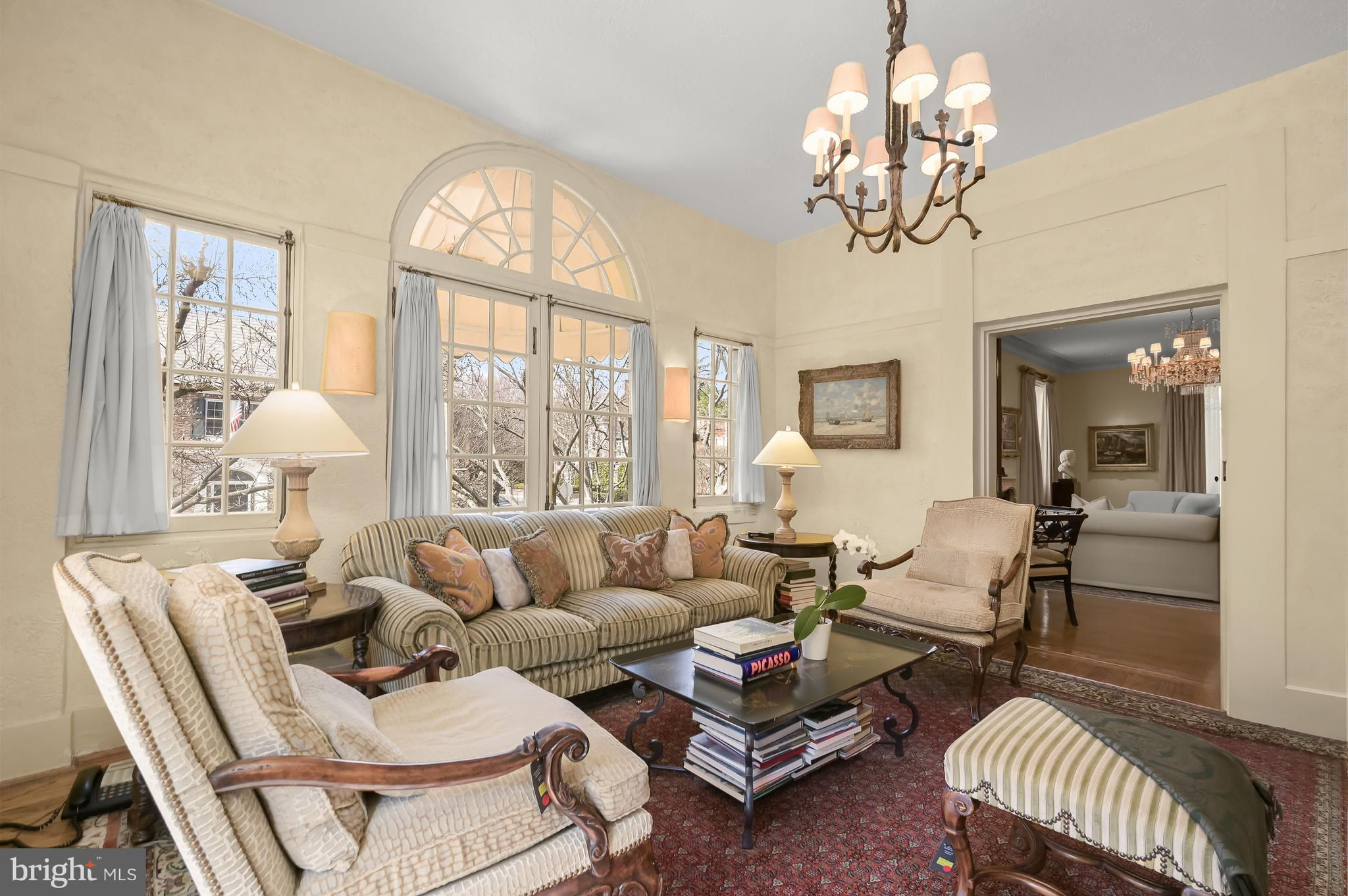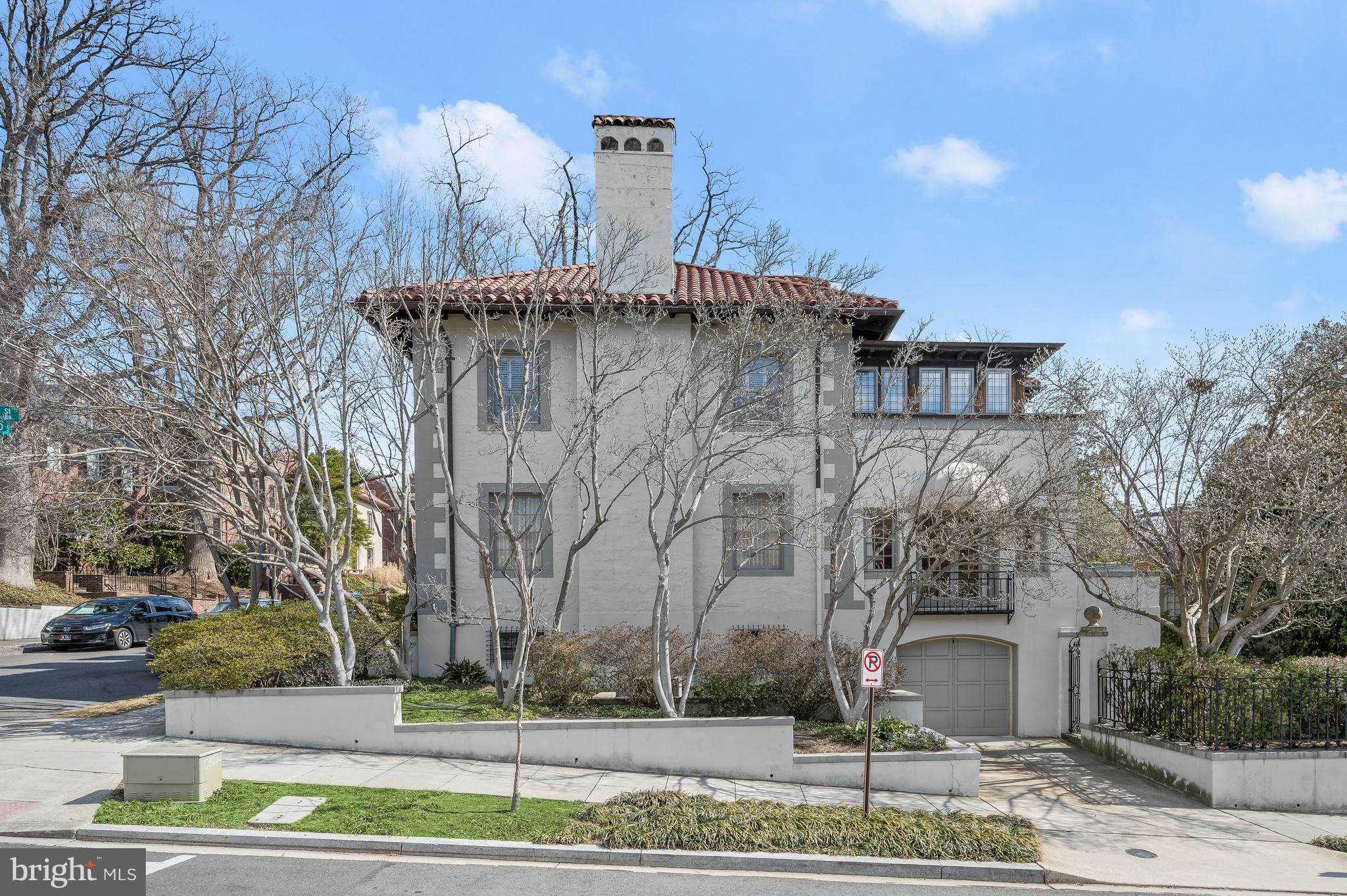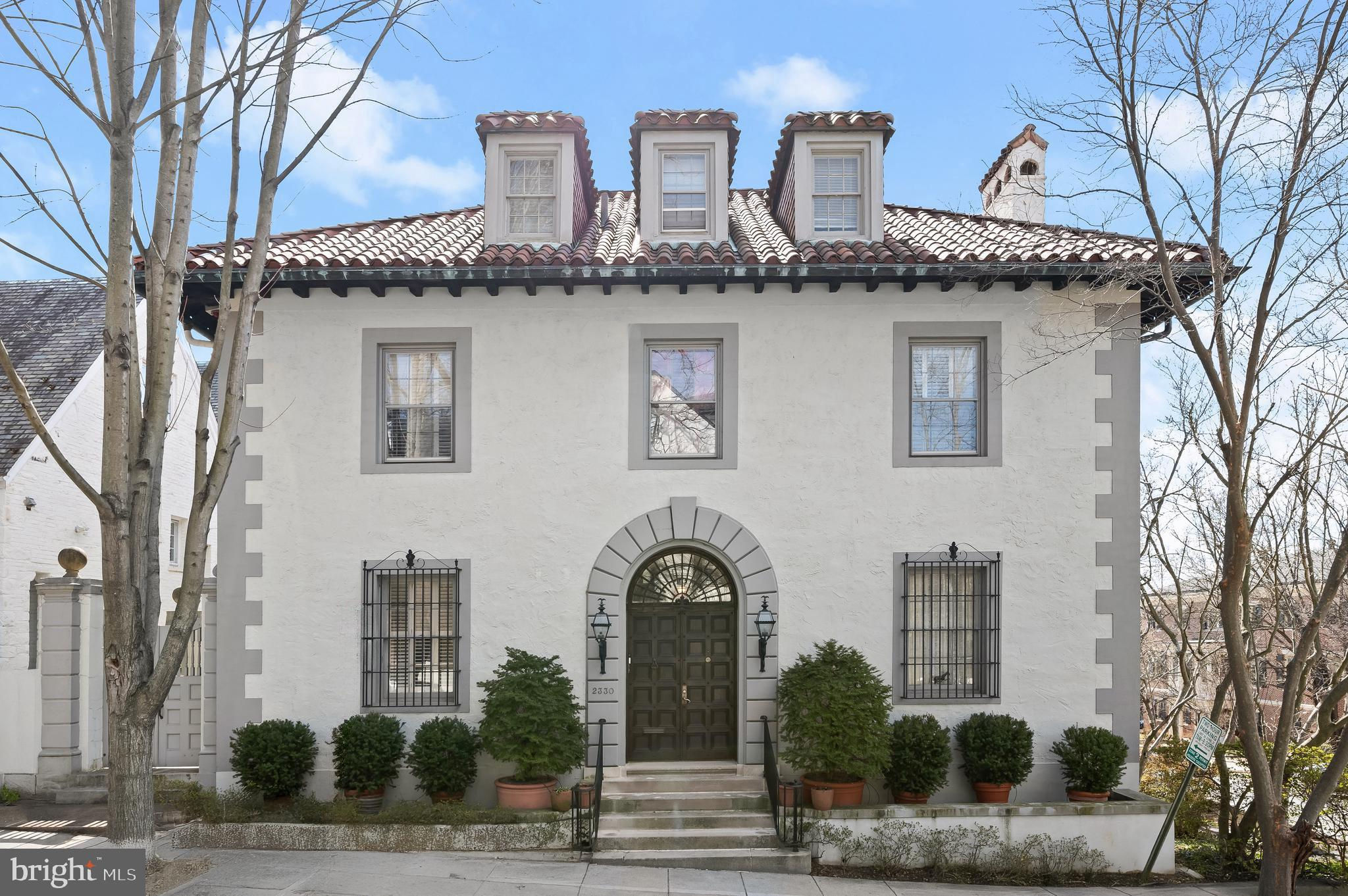 PUBLIC OPEN HOUSE! SUNDAY OCT 5TH, 2-4PM** Nestled in the prestigious Kalorama neighborhood, 2330 Tracy Pl NW is a breathtaking Mediterranean Revival residence that epitomizes elegance, grandeur, and architectural refinement. Built in 1923, this stately four-level residence showcases the craftsmanship of a bygone era while offering modern comforts for refined living. The home’s hand-troweled stucco and stone façade, quoined corners, arched entryways, and terracotta roof tiles create a striking first impression. Its handsome wood-paneled doors lead into the vestibule, where intricate ironwork and arched glass French doors open to a magnificent Entrance Hall wrapped in hand-troweled stucco walls and gleaming marble floors—an exquisite introduction to the home’s unparalleled classic elegance. Designed for both grand entertaining and intimate gatherings, the main level offers beautifully proportioned formal rooms. The elegant living room boasts soaring ceilings, an exquisite stone fireplace, and decorative millwork, all illuminated by large windows and a stately crystal chandelier. A sunlit sitting area, framed by arched Palladian windows and French doors, opens to a seating area on the balcony overlooking the rear yard, offering a view of the verdant lawn, mature trees and manicured plantings. The formal dining room exudes timeless sophistication. Floor-to-ceiling French doors invite the outdoors into every dining experience by giving guests direct access to an extensive balcony overlooking the rear yard and courtyard beneath its arched loggias below. A second ornate stone fireplace anchors the room, creating warmth and a perfect setting for unforgettable evenings. The gourmet kitchen is beautifully appointed with professional-grade Thermador, Sub-Zero, and Viking appliances, glass-front cabinetry, and a wine refrigerator. A butler’s pantry off of the formal dining room provides additional preparation space, ensuring effortless entertaining. A powder room and a coat closet are discreetly positioned nearby, preserving the main level’s refined aesthetic without compromising convenience. The grand staircase leads to the upper living quarters, where the owner’s suite spans nearly the entire second level. This suite includes an expansive dressing room, a large walk-in closet, and a spa-like en-suite bathroom complete with a jetted soaking tub, dual vanities, bidet and standing shower with seating. The bedroom boasts a magnificent fireplace and opens to a spacious sitting room. An additional bedroom and full bathroom complete this second level. The next level up offers an additional well-proportioned bedroom, a den or sitting room, two full bathrooms, and built-in storage, providing privacy and comfort for family and guests alike. The lower level features an office, a full bath, a spacious laundry room, ample storage, and a two-car garage. Surrounded by embassies, ambassadorial residences, and some of the city’s most architecturally significant homes, 2330 Tracy Pl NW offers a distinguished setting just moments from Dupont Circle, Woodley Park, Georgetown, and Rock Creek Park. This exceptional home is a testament to Mediterranean Revival design, where historic elegance meets modern refinement.