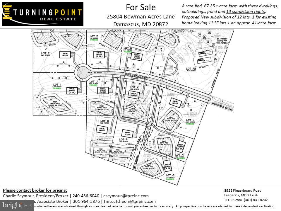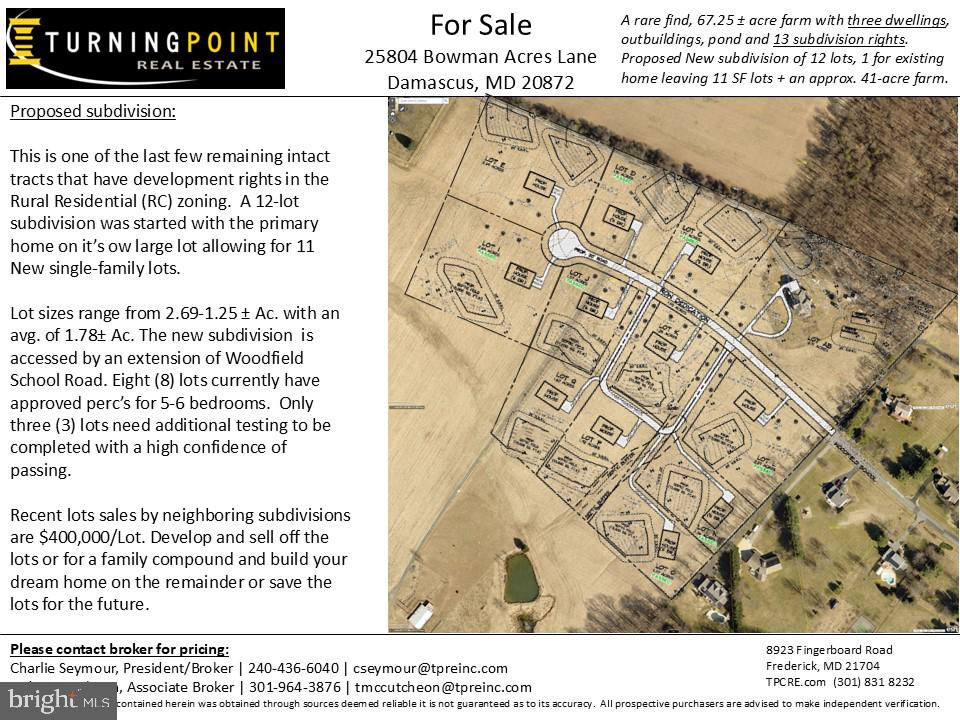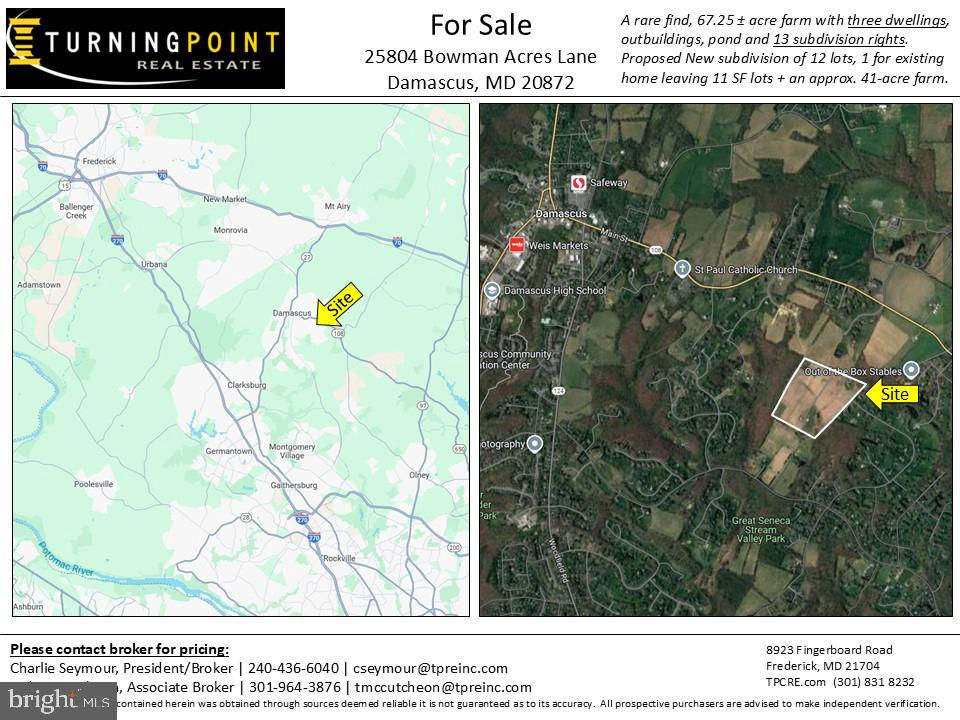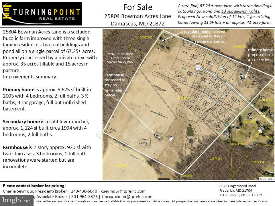 Discover a breathtaking 67 ± AC farm ideal for a family compound with three existing houses: a primary home built in 2005, a rancher-style home built in 1994, and a farmhouse requiring restoration. Subdivision potential for 11 additional lots - 8 with approved percs. Nestled amidst beautiful rolling farmland with outbuildings and pond, enjoy the tranquility of this scenic location which backs up to large wooded forest buffer of Great Seneca Stream Valley Park. Embrace the beauty and potential of this idyllic countryside retreat, where timeless charm meets modern opportunity. Property selling "as is, where is, with all faults."