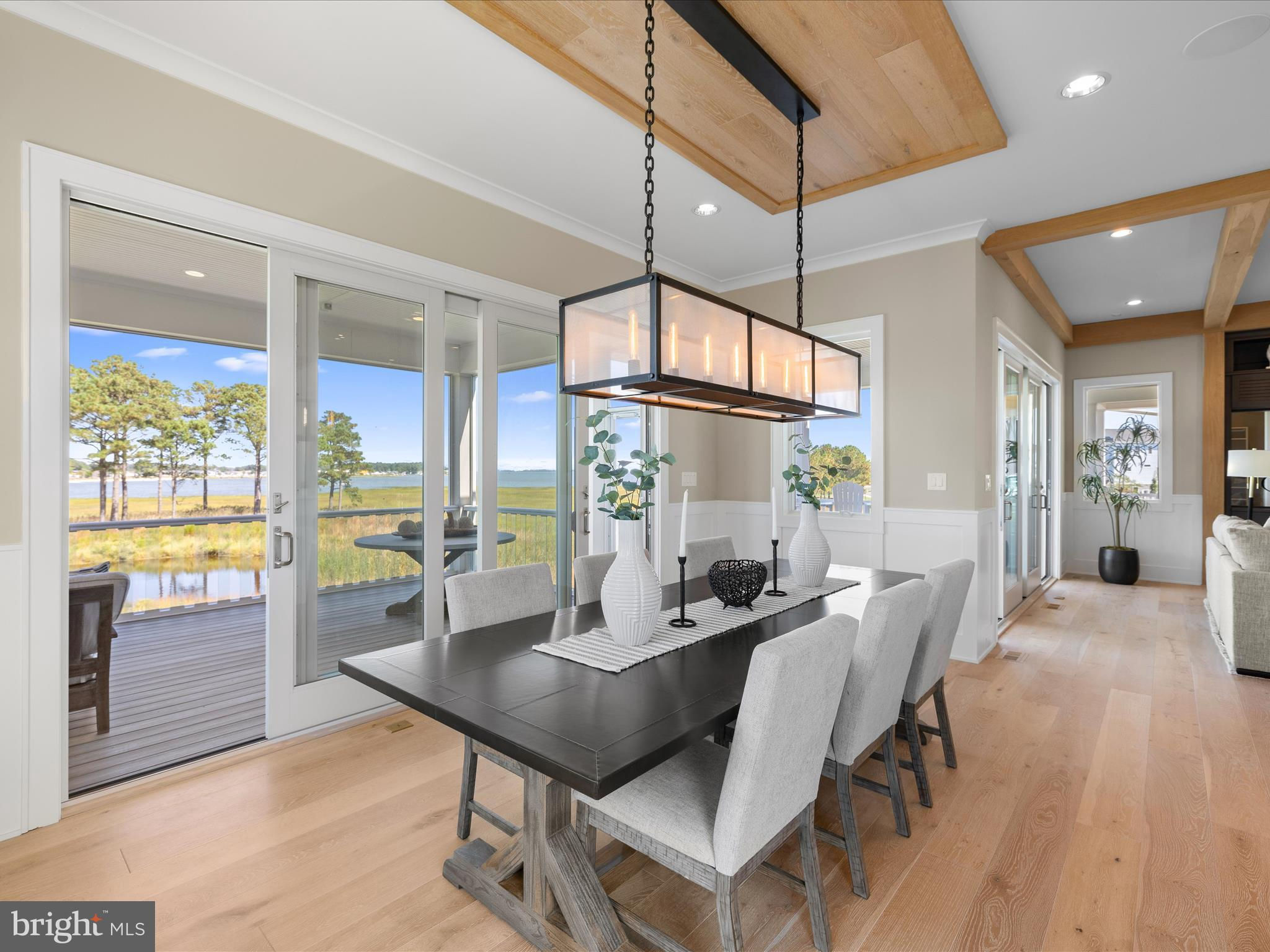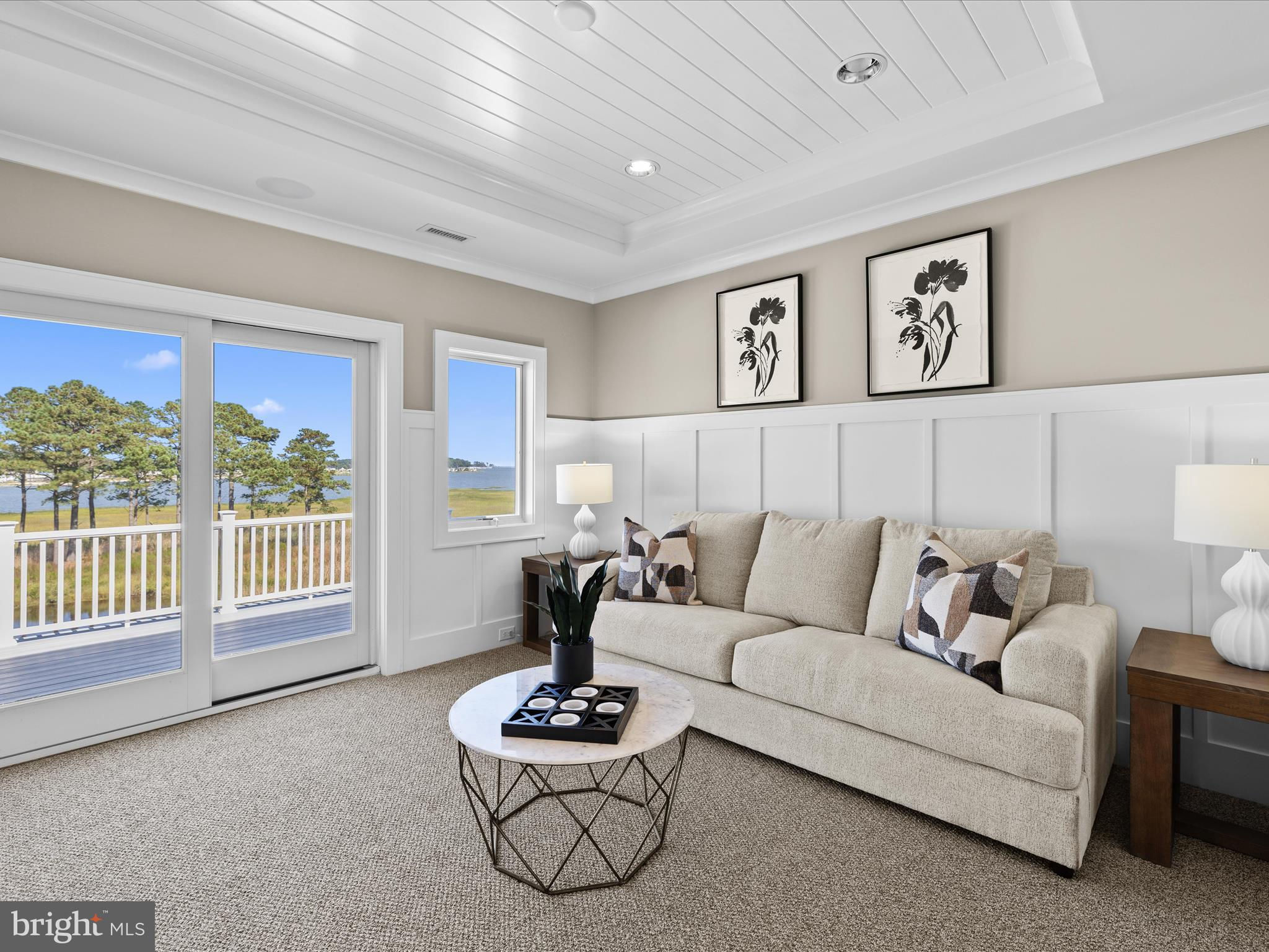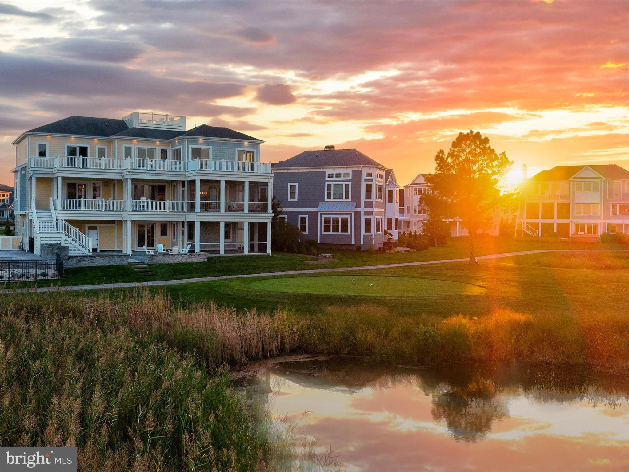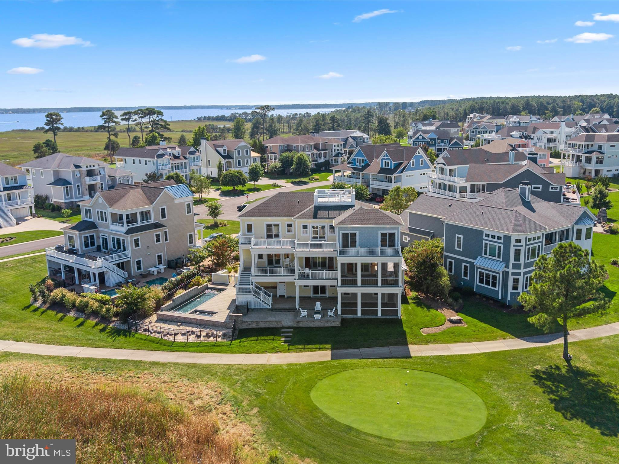 A Sanctuary of Coastal Elegance with Endless Views A one-of-a-kind masterpiece by Echelon Homes, this custom-designed residence marries contemporary coastal style with subtle industrial cues, delivering awe-inspiring luxury at every turn. Nestled within the prestigious Jack Nicklaus Signature Golf Course community of The Peninsula, this extraordinary home rises in the exclusive Sanctuary enclave, perched on the pinnacle of Sand Dollar Drive. Designed to maximize its spectacular position, the residence offers three levels of living with sweeping 360-degree views of the Indian River Bay, Lingo Creek, and the 8th Tee. From the moment you arrive, casual elegance blends seamlessly with quality craftsmanship and coastal sensibility. Wide-plank hardwood floors, shiplap, judges paneling, beamed ceilings, and custom built-ins unify the interiors, while designer lighting adds glimmering sophistication. The main level foyer opens to the great room, where floor-to-ceiling atrium sliders flood the space with natural light, showcase breathtaking views, and extend effortlessly to an expansive balcony deck. The living room is anchored by a soaring quartz-clad fireplace, accented with black steel and flanked by elegant glass-and-wood display cabinets. An open-beamed ceiling heightens the drama, creating a stunning focal point. This central gathering space flows into the gourmet kitchen and dining area, a showcase for both entertaining and daily life. Quartz surfaces span generous work areas and the oversized center island, complete with abundant storage, beverage and wine refrigerators, deep undermount sink, and built-in oven. A striking glass tile backsplash highlights the GE Monogram six-burner range with custom vent hood, while a suite of professional-grade stainless appliances completes the space. A walk-in pantry with custom floor-to-ceiling storage ensures both beauty and function. Dine casually at the breakfast bar, host formal meals in the adjacent dining room, or step through sliders to the screened porch, where dazzling sunsets over the bay make every evening extraordinary. This level also offers a refined home office with balcony access, a stylish hall bath, and the first of five bedrooms, complete with ensuite. Ride the elevator to the primary suite retreat, where panoramic views greet you from bed beneath a soaring cathedral ceiling of shiplap and beams. The spa-inspired ensuite rivals a five-star resort, with two vanities, soaking tub, walk-in shower, private water closet, and dual walk-in closets with abundant storage. Two additional guest suites, each uniquely styled with private ensuites, one with balcony access, ensure comfort for family and friends. A second-floor laundry adds convenience, while a welcoming family room with balcony access serves as the perfect gathering spot. From here, a staircase leads to a bonus loft and the crowning jewel of the home: a rooftop terrace offering unrivaled 360-degree views. The lower level, filled with natural light, high ceilings, and precise millwork, is designed for entertaining. A game and lounge room, sizable guest bedroom, hall bath, second laundry, and mudroom entry complement the oversized two-car garage and additional third garage. Beyond the garages, a pool bath leads to the outdoor oasis. Here, a hardscaped paradise awaits: heated pool, spa, firepit, lounging areas, covered bar patio, and a screened pavilion, all perfectly positioned to embrace the home’s remarkable setting. As a resident of The Peninsula, you’ll enjoy world-class amenities, including gated security, a stunning clubhouse, the Jack Nicklaus golf course and driving range, a state-of-the-art fitness center with indoor, outdoor, and wave pools, hot tubs, saunas, spa rooms, tennis and pickleball courts, dog park, community garden, nature center, bay beach, fishing pier, and miles of walking trails. Come home to comfort, luxury, and resort living at its finest.