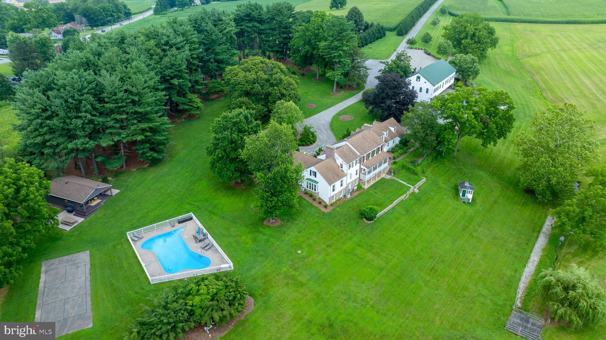 Discover a Private Paradise in Spring Grove, PA – Where History, Nature, and Endless Opportunity Meet. Tucked away in the heart of the breathtaking Spring Grove countryside, this extraordinary estate is more than just a home—it's a secluded sanctuary, a celebration of nature, and an inspiring canvas for your dreams. Spanning over 148.4 acres of pristine land, this property offers unmatched privacy, stunning scenery, and limitless potential. A dramatic, tree-lined driveway sets the stage for what’s to come, guiding you to a remarkable 1960s stone farmhouse that radiates character and timeless elegance. Inside, original wood floors whisper stories of the past, while four stone fireplaces invite cozy nights by the fire. With five beautifully appointed bedroom suites—each with its own private full bath—this home blends rustic charm with modern comfort in perfect harmony. Designed for both peaceful retreat and unforgettable gatherings, the estate features a spectacular venue barn, and a luxurious in-ground pool with a pool house that's practically a second home: complete with indoor showers, bathroom facilities, a full kitchen with island seating, and sliding glass doors that open right onto the pool deck. Whether you're hosting enchanting weddings under the stars, intimate baptisms by the pond, or spirited fundraisers on the expansive patio, this property was made for memory-making. Fenced pastures, a gentle stream, and a picturesque pond add even more charm to the landscape, offering moments of quiet reflection and endless exploration. This rare gem is perfect for those who crave a slower pace, nature lovers yearning for space to roam, or visionaries ready to turn this dream setting into an income-producing venue. Live here, host here, grow here—whatever your path, this one-of-a-kind estate offers the perfect balance of elegance, functionality, and natural beauty. Come explore the possibilities. Your countryside retreat awaits.