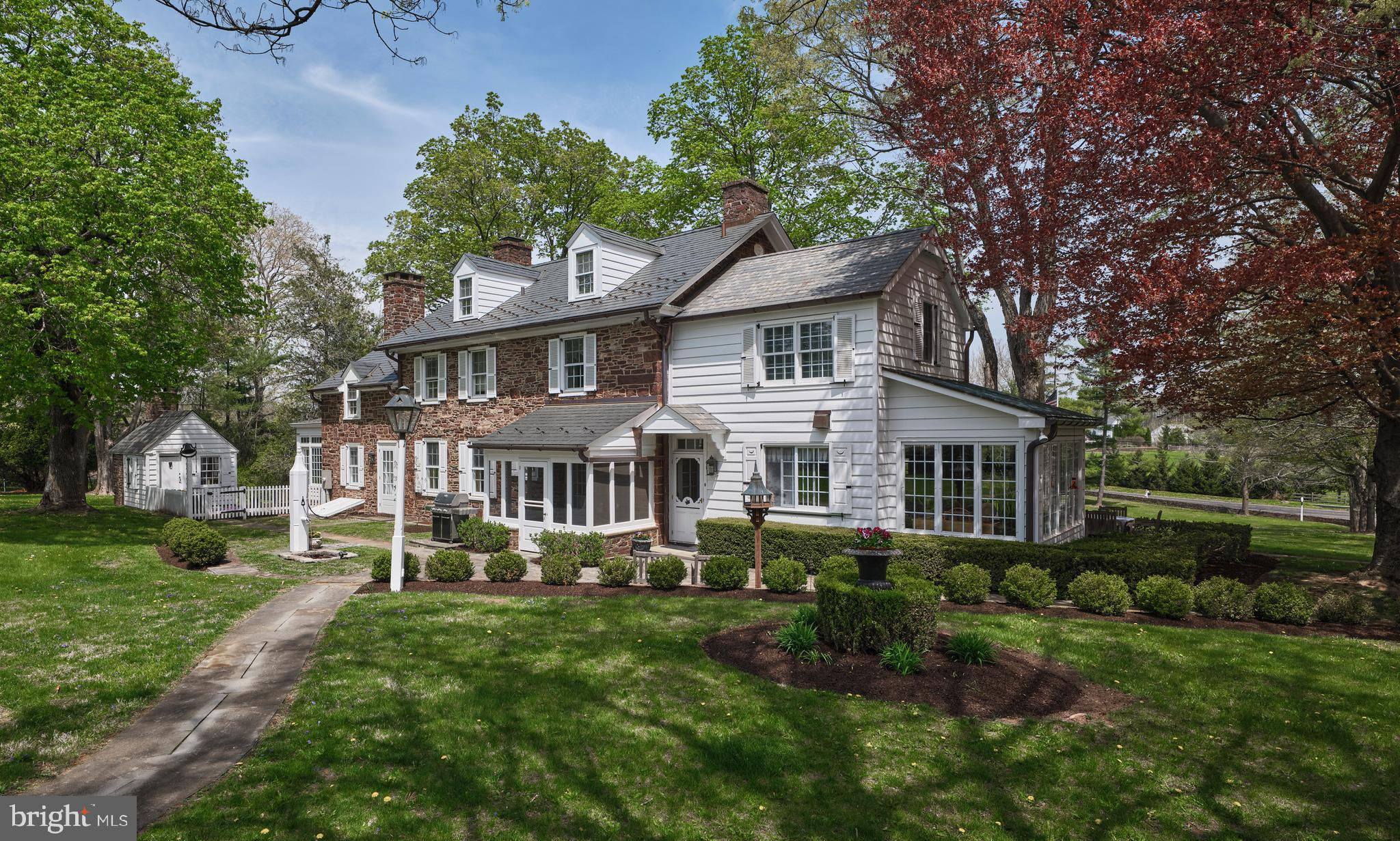If you are seeking a true Bucks County Estate rich in history and elevated for todays living, then this is it! Overlooking picturesque Cabin Run Creek and bucolic farmland this Bucks County estate dates back to Circa 1785, a rare offering— restored and expanded set on over 12.5 acres of rolling and open land on a postcard setting! At its heart is a magnificent 4 bedroom stone farmhouse, where original character meets refined country living. Rich with exposed stone walls, antique beams, and bespoke craftsmanship, the home opens to a series of inviting outdoor spaces—stone terraces, a walled courtyard, a serene pool setting and gardens bordered by dry-laid stone walls throughout. Ancillary structures include the main barn with radiant-heated, finished lower-level barn currently used as an entertaining and office retreat , but would also make a signifiant studio space for an artist, designer or can easily be converted back to a working barn with Dutch doors that open to pastoral views. Endless possibilities, with kitchen and full bath. Additionally a separate oversized 3 car garage with 2 bedroom, light and airy full service carriage house. An additional 24+ acre parcel—unpreserved with its own separate road access is available for purchase. This land offers remarkable potential for equestrian pursuits, farming, pasture, or the creation of a second residence. A setting of rare beauty and privacy, this is more than a home—it is a generational estate in one of Bucks County’s most picturesque valleys. Close to Philadelphia, Doylestown and close proximity to all amenities and I 78. An impressive Country Estate!