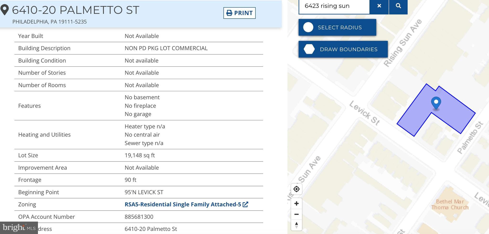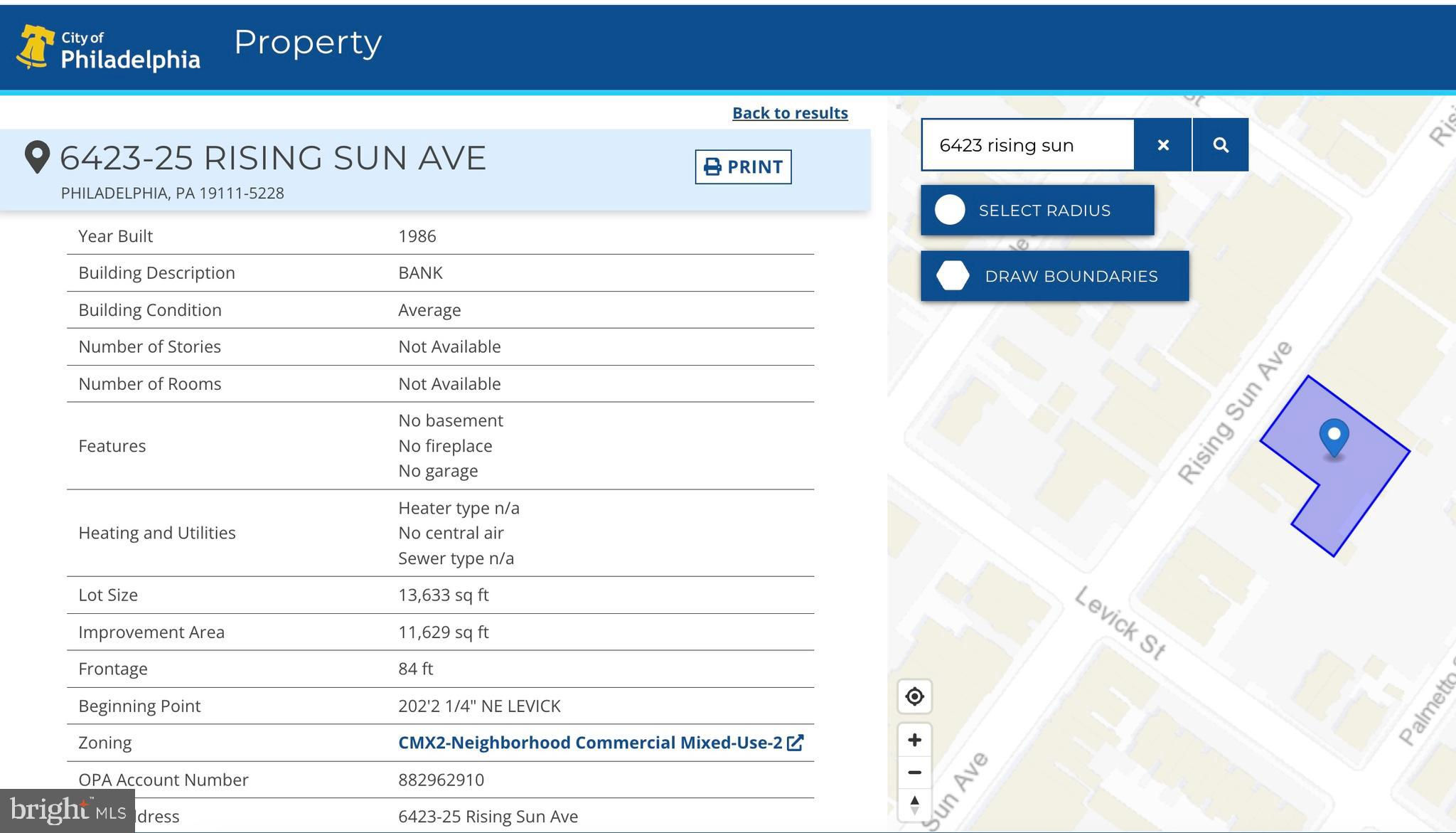 Great Opportunity for an investor and an owner to occupy this 11,629 square feet with a finished basement of 3471 square feet located on 6423-25 Rising Sun Ave. The bank has both entrances from Rising Sun Ave and a parking lot with a large open corridor, lobby, waiting area, personal banker cubicles, reception, meeting room, teller vault, safe deposit vault, men + ladies bathroom, 2-private executive office with bath, lunch room, 2 large conference room with plenty of storage rooms. The adult care center has both entrances large lobby, 4 private offices, a large conference room in the back with a kitchenette, a work room, and 4 bathrooms. The finished basement has 5 large office rooms, 2 baths, a kitchenette, utility rooms, and plenty of storage spaces. There are sprinkler systems in the building, the new roof was installed in April 2024 and the adult care was renovated a few years ago. There are 6 rooftop HVAC Units and 3 were installed after 2017. There are large signages in the front and the back street. Currently, both tenants Bank of America's 7,398 sf and the Adult Care center's 4231 square feet are occupying. This sale included 2 additional lots currently 75 parking spaces 6410-20 Parlmetto Street #885681300 and 6422 Palmetto Street # 885682140. The parking lots are shared between both tenants now and the bank does have a drive-thru in the back. Both front entrances are on Rising Sun Ave and the parking entrance and exit are on Levick Street and Palmetto Street. Conveniently located on this busy Rising Sun Ave in the most desirable Northeast Philadelphia, Minutes to Montgomery County, Center City. Also, the building is for lease at $22.00 per square foot. The buyer and agent must check the size and zoning. All showing must send POF before showing.