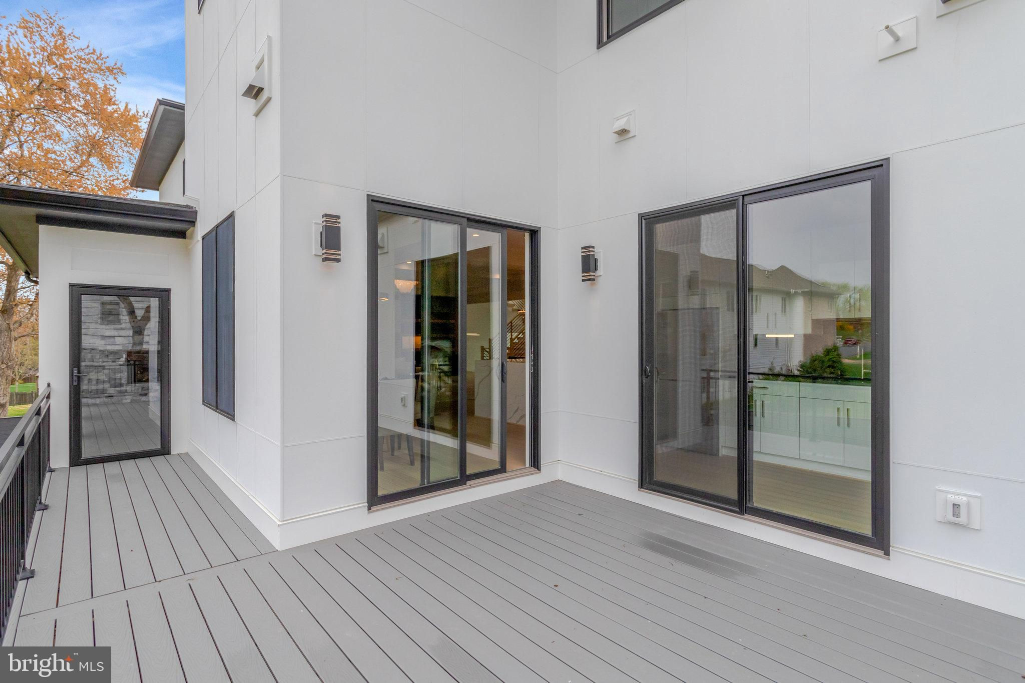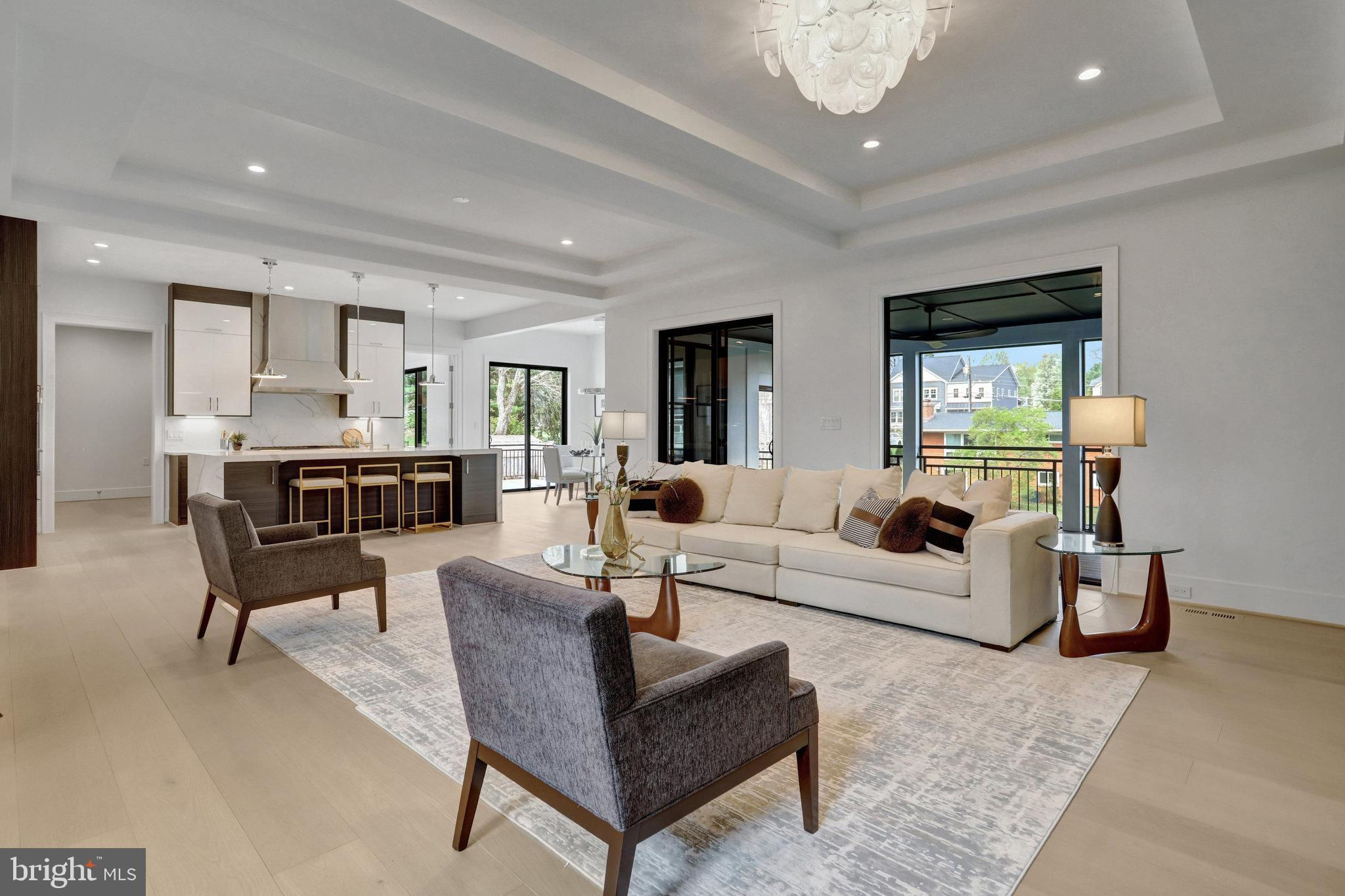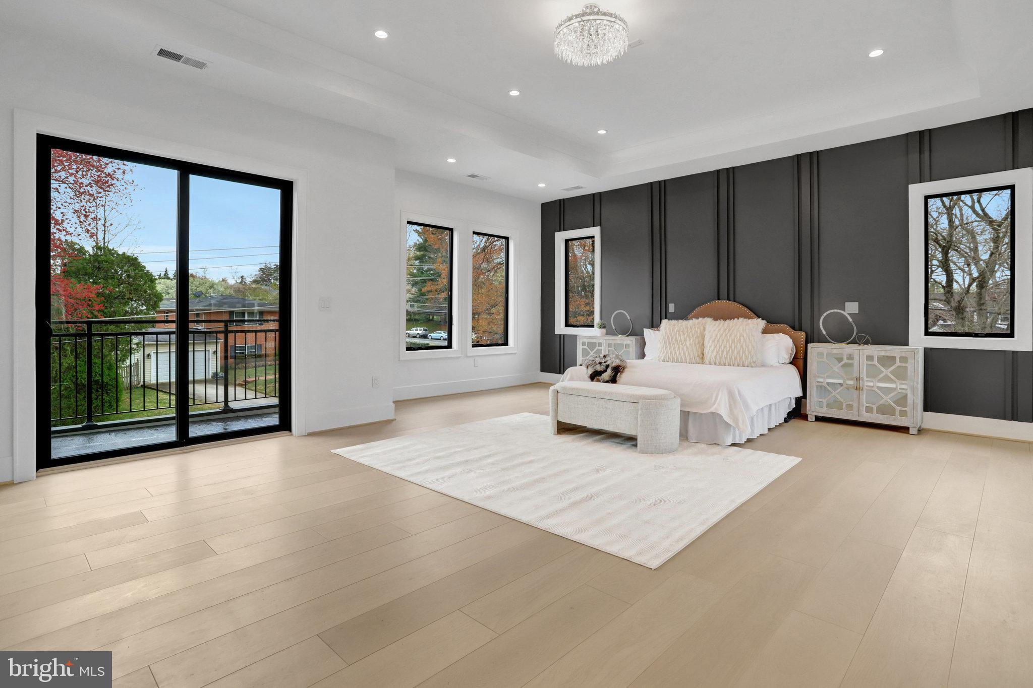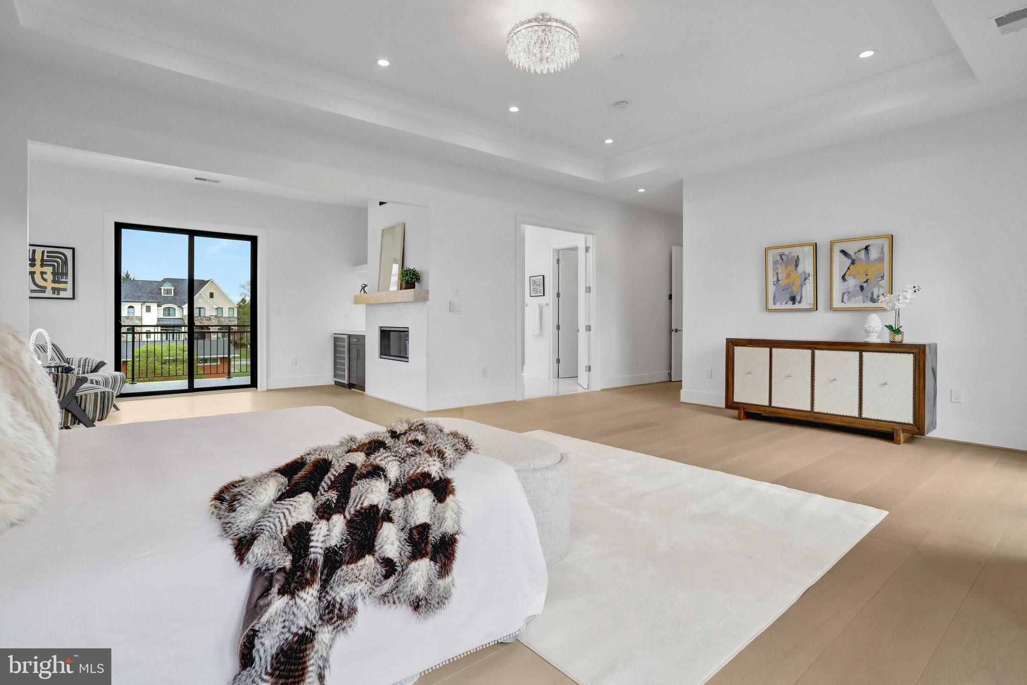 This striking, modern home offers an expansive 8,453 SqFt of living space with 4 CAR GARAGE, thoughtfully designed across three levels. With its distinctive contrast of luxury finishes and meticulous craftsmanship, the home blends comfort and contemporary style effortlessly. Upon arrival, you're greeted by a pre engineered wood wide plank floor, flanked by side light panels and elegant sconces, setting the tone for the refined interiors. The foyer leads into the heart of the home: an open-plan kitchen and family room that serve as a central hub for daily living. The chef’s kitchen is equipped with professional-grade Thermador appliances, including a six-burner gas stove, double wall ovens, and a built-in coffee machine. White marble countertops and two-tiered designer cabinetry with under-cabinet lighting provide a sophisticated contrast to the grey cabinetry. Additional features include a prep sink, microwave, dishwasher, and quartz drawer pulls and cabinet knobs. Pendant lighting with brushed brass accents completes the elegant atmosphere. In the family room, a floor-to-ceiling stone gas fireplace with a wooden mantle and built-in side shelving creates a focal point, while French doors open to a covered porch, seamlessly connecting the indoors and outdoors—ideal for both relaxation and entertaining. A professionally appointed prep kitchen enhances the space, featuring a four-burner gas stove and refrigerator, conveniently located next to a walk-in pantry. The 4-car garage, with Garage 1 offering ample depth to park two cars or a RV , is easily accessible via the mudroom, which includes a built-in bench and coat rack. An ensuite bedroom on this level provides privacy and luxury, featuring a floor-to-ceiling tiled shower and custom closets. The second-floor landing invites relaxation, with built-in shelves, an entertainment center, and ambient lighting. The centerpiece of this level is the luxuriously appointed owner’s suite. This oversized bedroom includes a separate seating area with a fireplace and coffee bar, along with dual balconies, perfect for intimate dining or relaxation. A gas fireplace with a wooden mantle, a tiered ceiling with recessed lighting, a crystal chandelier, and a ceiling fan create both comfort and elegance. The walk-in closets are expansive, with built-in shelves and drawers. The spa-like owner’s suite bathroom is designed for ultimate relaxation, with marble floors, dual vanities featuring smart-controlled heating, an aroma diffuser, a standalone bathtub, and an oversized shower with multiple shower heads, a seamless glass enclosure, a built-in bench, and a steam bath feature. The practical laundry room is equipped with tiled flooring, ample cabinetry, and a built-in drying rack. All other bedrooms on this level are ensuite, each featuring custom walk-in closets and bathrooms with marble countertops and tiled floors. The lower level combines functionality with luxury, offering both relaxation and entertainment options. The recreation room, the heart of this space, features a sophisticated wet bar and a cozy stone fireplace, complemented by luxury vinyl tiles and elegant paneling. A media room with tiered seating and an exercise room with access to a full bathroom and sauna complete this level. Ideally situated in the coveted Lewinsville Heights neighborhood of McLean, this home is easily accessible to major freeways, the Tysons metro station, and Tysons Mall. As an upgrade, a pool can be added, further enhancing this home’s luxurious offerings.