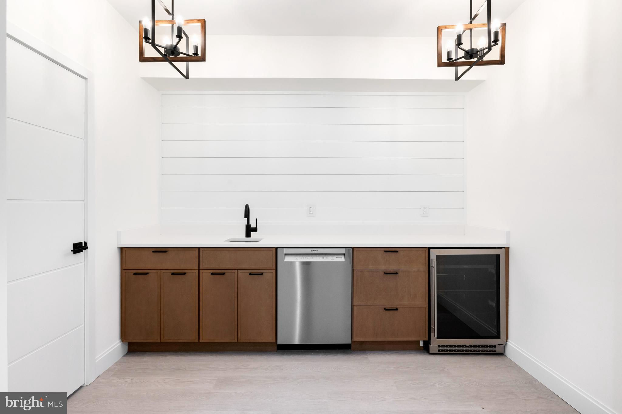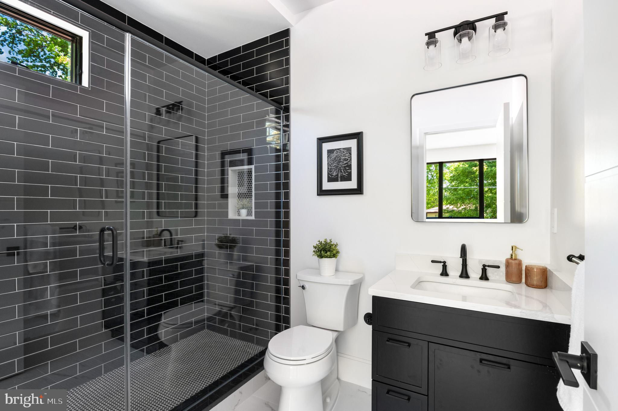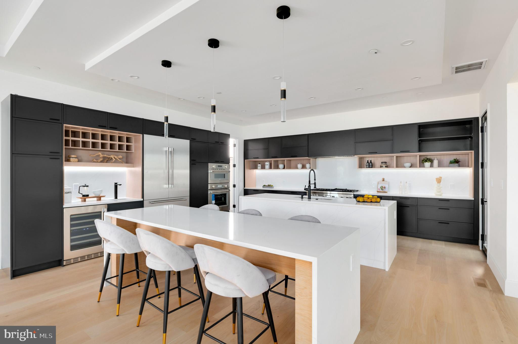 Main features Located in the highly sought-after Kenwood Park neighborhood, this brand-new residence by Red & Friends, design and interiors by Duren Projects, sits on an expansive quarter-acre corner lot and offers over 6,500 sq ft of living space. The home features five bedrooms (with an optional sixth), five full bathrooms, two half bathrooms, and an elevator-ready shaft. Ideally situated, it is just 5 minutes to downtown Bethesda, near to Westbard Square’s new shops and restaurants, the Metro, major commuter routes, and offers direct access to Washington, D.C. Design & Finishes A true custom build, this home showcases high-end design details throughout. The interior seamlessly blends colors and textures, enhanced by sophisticated lighting fixtures in all main rooms. 7.5” wide solid white oak flooring, complements contemporary custom steel railings with matching white oak handrails, while extra-large Andersen 400S windows bathe the home in natural light, creating an elegant architectural flow. Main Level Soaring 10’ ceilings create an open and inviting atmosphere. The layout features a welcoming foyer, an elegant formal dining room, a sun-filled seating area/studio, and a spacious family room with gas fireplace. The gourmet kitchen is designed for both function and style, offering two distinct islands: a cooking island with Thermador appliances and a bar island adjacent to the wet bar area, plus a separate dining room overlooking serene trees. Custom cabinetry, a walk-in pantry, quartz countertops and backsplash, and 16-foot sliding glass doors to the covered porch complete the space. A designer powder room, mudroom with expanded storage space, and 2-car garage finish this level. Second Level The luxurious primary suite boasts dual walk-in closets and a spa-inspired bathroom clad in warm wood-toned porcelain, featuring a soaking tub, double-shower-head walk-in shower, and dual vanities with LED mirrors. Three additional bedrooms include en-suite baths, complemented by an open loft and a convenient laundry room. Lower Level The expansive recreation room with wet bar and wine cellar/storage anchors this level. A flexible bonus room (perfect as a gym or additional bedroom), guest suite with en-suite bath, powder room, and a charming kids’ playhouse under the stairs complete this versatile space. Outdoor Living Professionally landscaped grounds offer a flagstone covered porch with brick-clad gas fireplace, plus a separate terrace off the kitchen ideal for grilling.