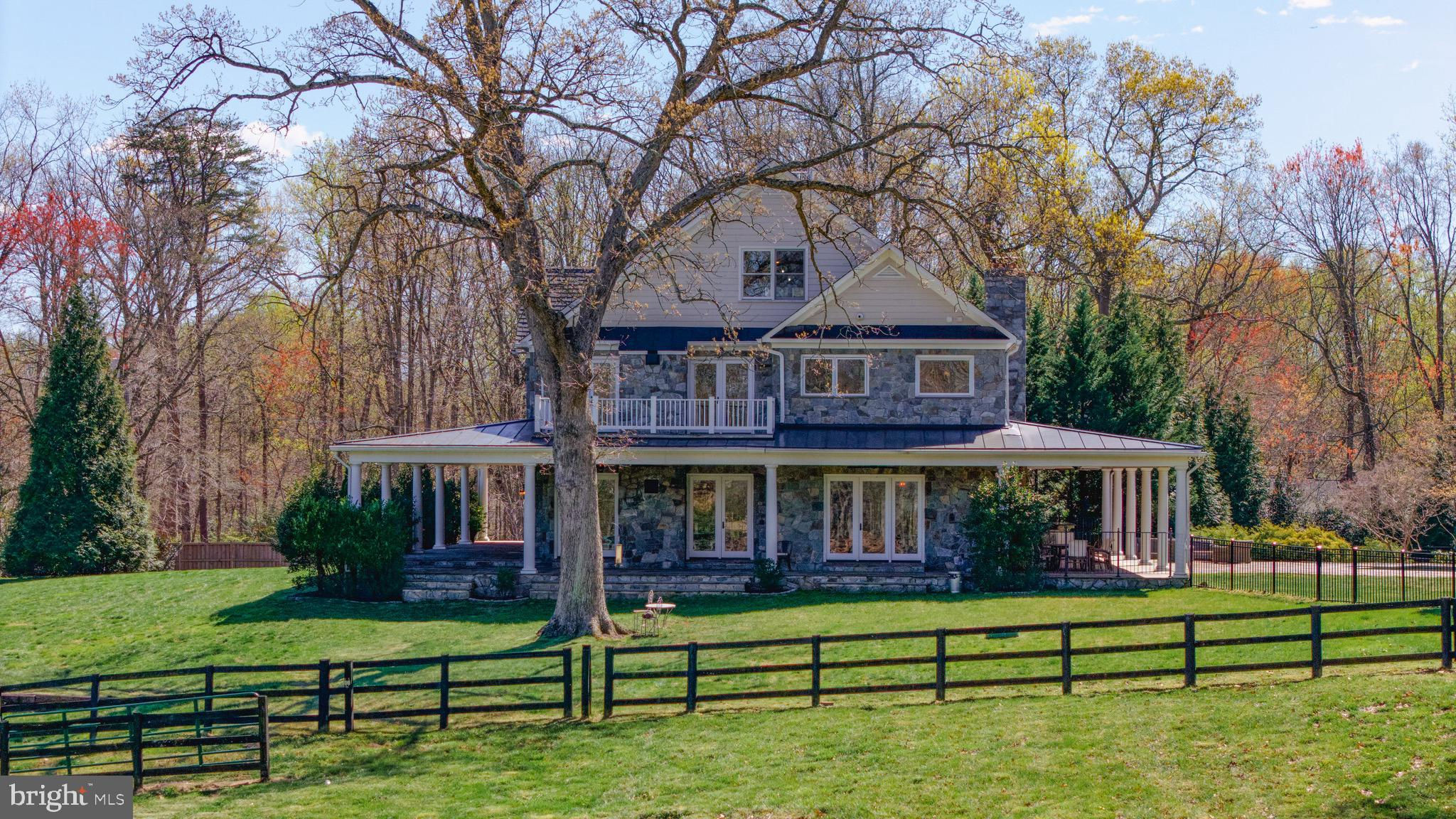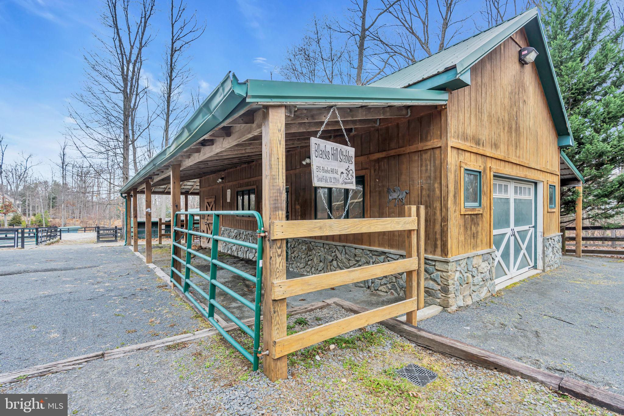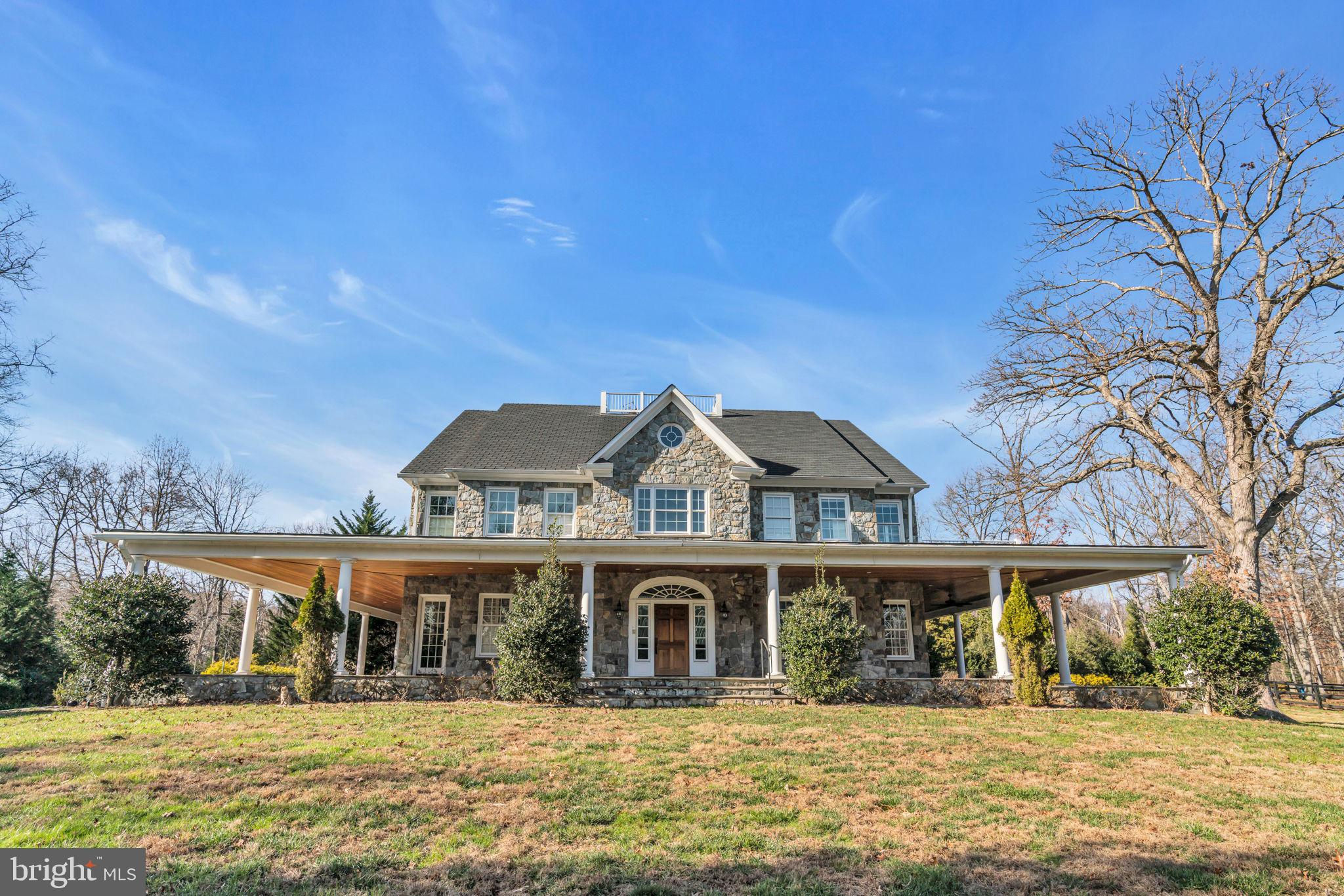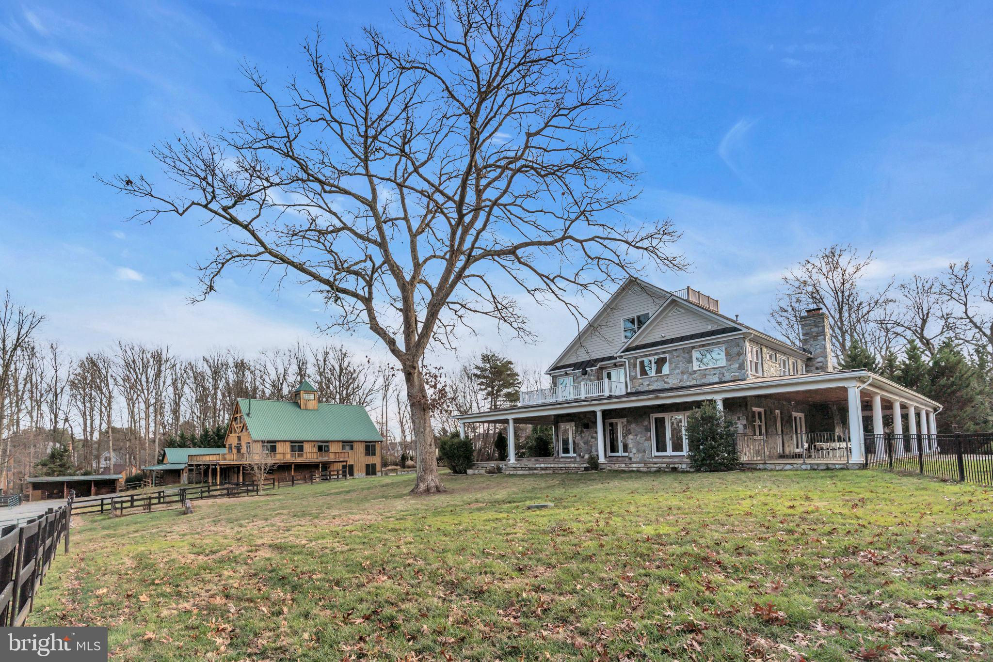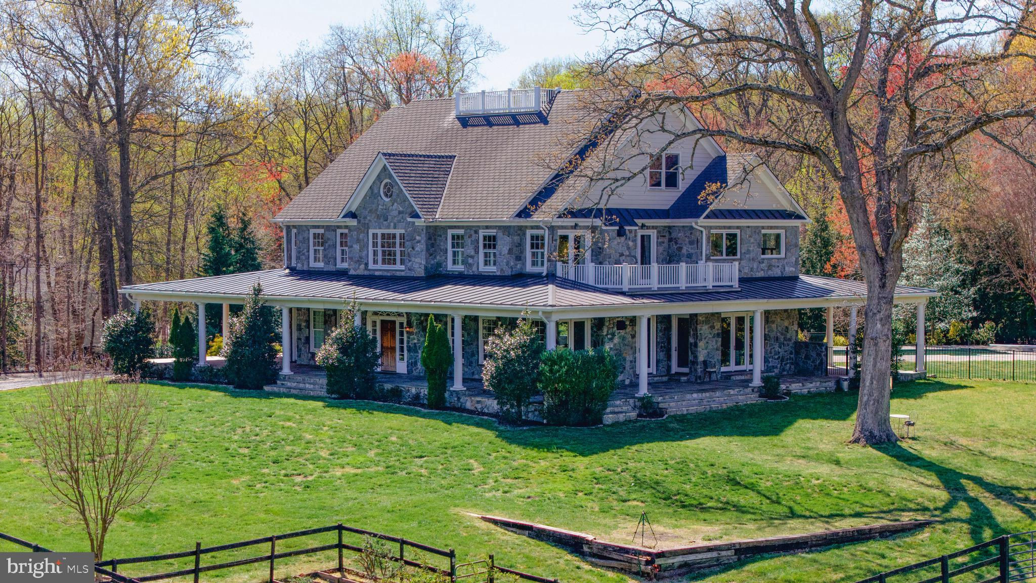 Welcome to 815 Blacks Hill Rd, a magnificent estate offering over 7,185 square feet of refined living space and 5.47 acres of land surrounded by breathtaking views. The property seamlessly connects to a nearby state-maintained roadway, ensuring easy access while maintaining a sense of serene seclusion. The home’s exterior boasts a spacious porch with an elegant tongue-and-groove ceiling that wraps around the residence, allowing for direct outdoor access from every primary-level room. Inside, you'll find broad plank hardwood flooring, soaring 10-foot ceilings, and a blend of decorative exposed beams and intricate coffered ceilings that add charm and sophistication. At the heart of the home lies a gourmet kitchen, perfect for both intimate meals and grand entertaining. The kitchen features an expansive island with bar seating, ideal for gathering and culinary creativity. The luxurious owner’s suite is a private retreat, offering dual bathrooms, two expansive walk-in closets, and a private balcony with tranquil views of the surrounding landscape. Outdoors, the amenities continue with a stunning pool area, an outdoor kitchen with ample bar seating, and a stone fireplace for cozy evenings under the stars. The expansive lawn provides plenty of space for outdoor activities, making it perfect for gatherings. For equestrian enthusiasts, the property includes a large barn that accommodates horses. The upper floor of the barn is equally impressive, featuring luxurious living quarters with a great room framed by panoramic windows, high cathedral ceilings with exposed beams, a kitchen with a large island, two bedrooms, 1.5 bathrooms, and a loft bunk room. The barn also includes several stalls, making it a perfect combination of functional and luxurious living. This property is a rare opportunity to own a piece of paradise in Great Falls, VA.