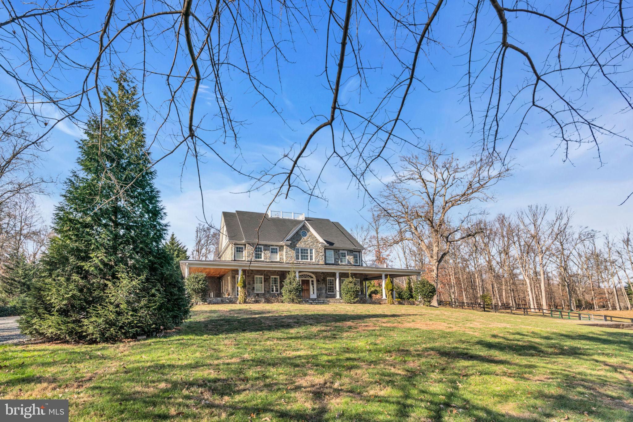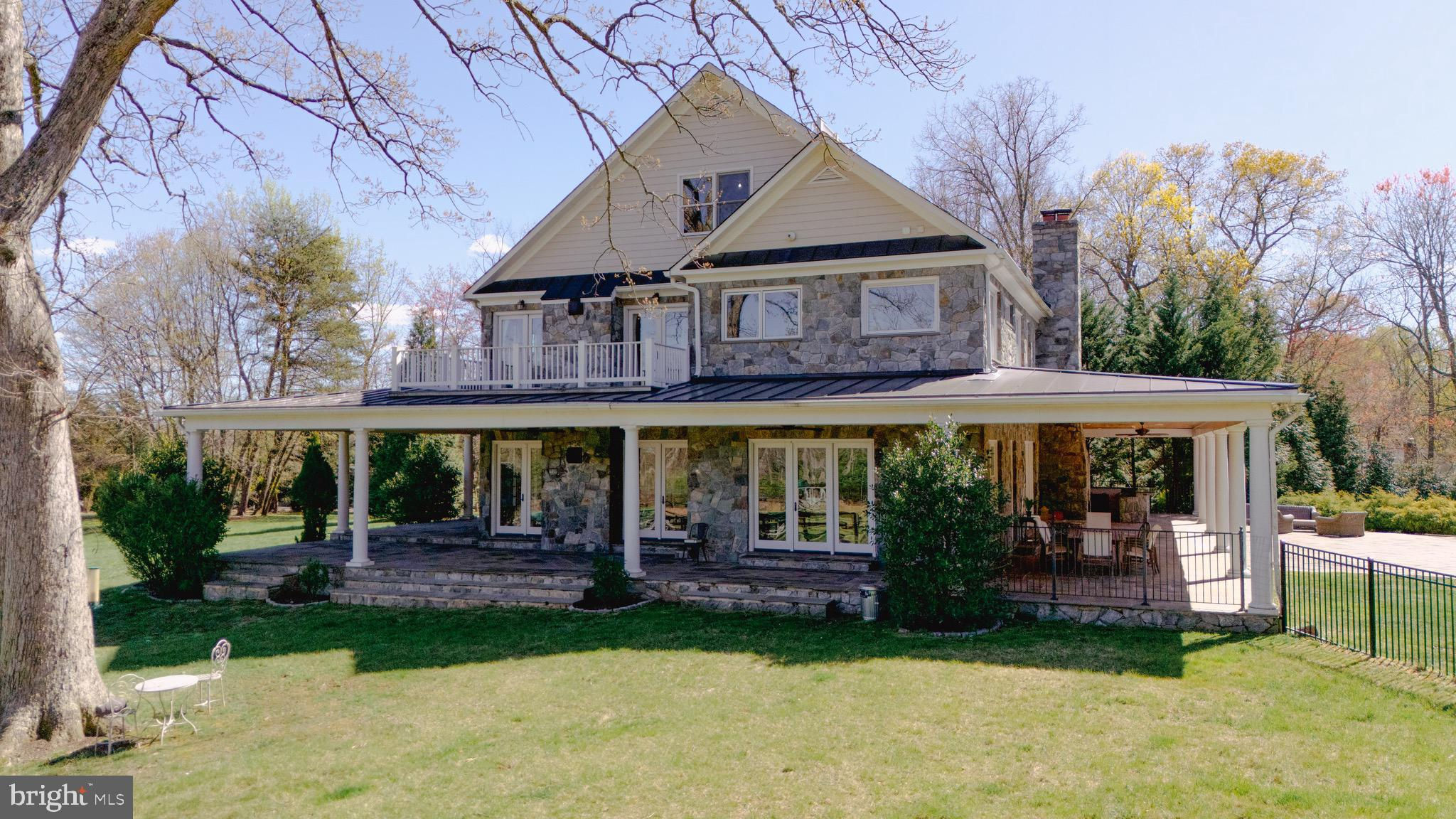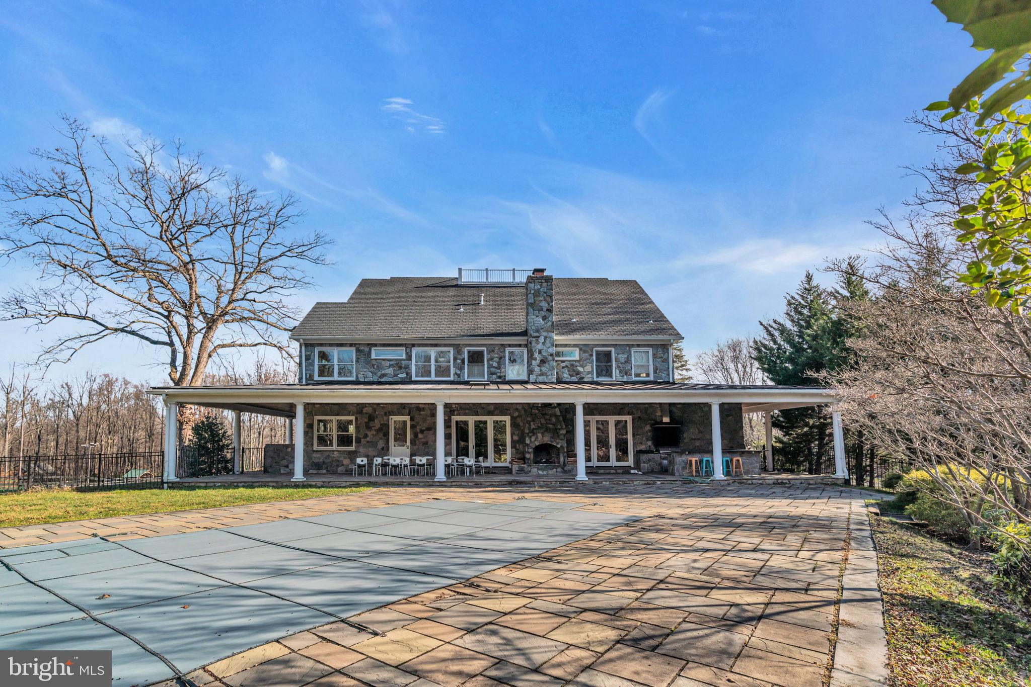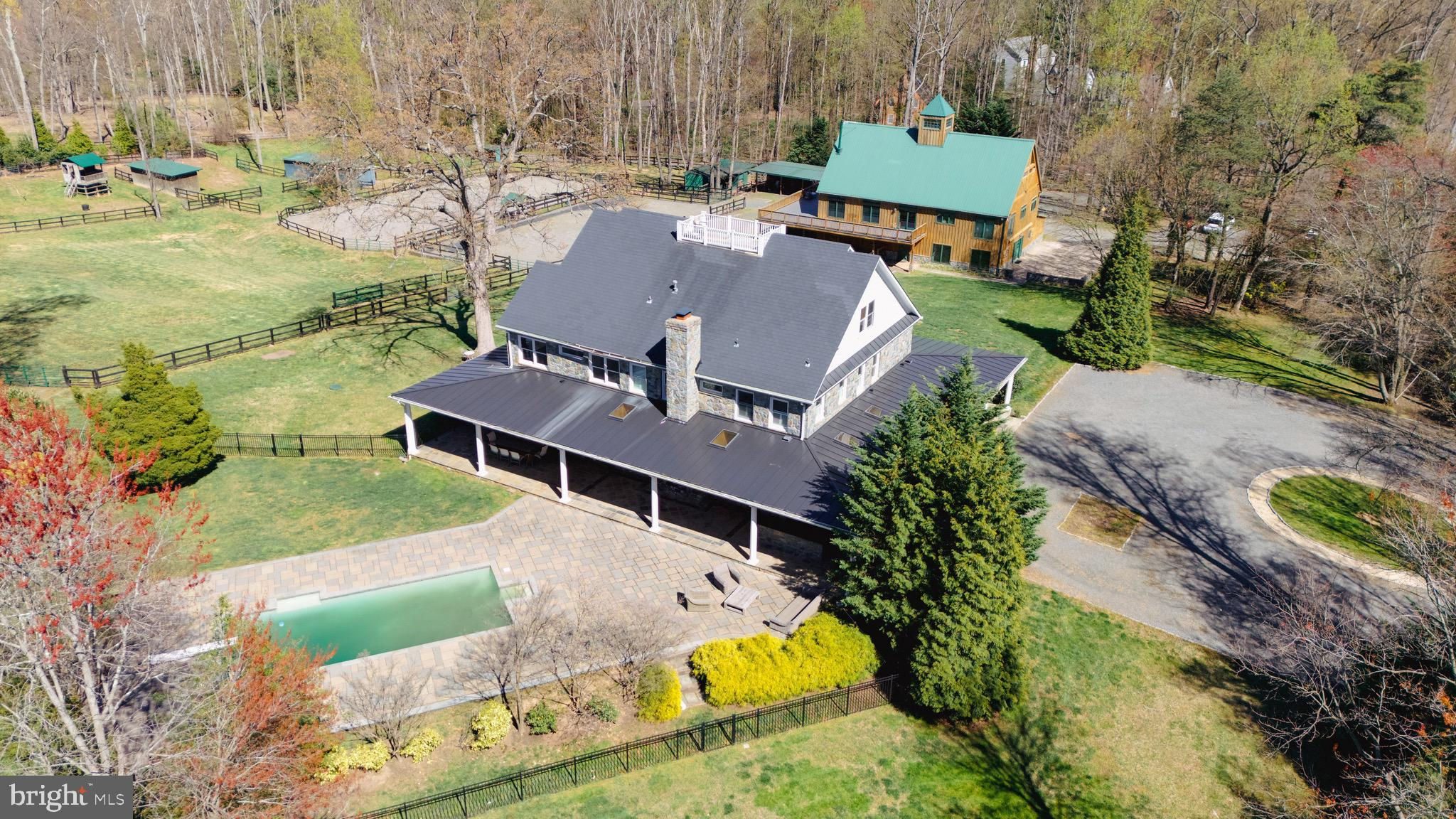 Welcome to 815 Blacks Hill Rd, a magnificent estate offering over 7,185 square feet of refined living space and 5.47 acres of land surrounded by breathtaking views. The property seamlessly connects to a nearby state-maintained roadway, ensuring easy access while maintaining a sense of serene seclusion. The home’s exterior boasts a spacious porch with an elegant tongue-and-groove ceiling that wraps around the residence, allowing for direct outdoor access from every primary-level room. Inside, you'll find broad plank hardwood flooring, soaring 10-foot ceilings, and a blend of decorative exposed beams and intricate coffered ceilings that add charm and sophistication. At the heart of the home lies a gourmet kitchen, perfect for both intimate meals and grand entertaining. The kitchen features an expansive island with bar seating, ideal for gathering and culinary creativity. The luxurious owner’s suite is a private retreat, offering dual bathrooms, two expansive walk-in closets, and a private balcony with tranquil views of the surrounding landscape. Outdoors, the amenities continue with a stunning pool area, an outdoor kitchen with ample bar seating, and a stone fireplace for cozy evenings under the stars. The expansive lawn provides plenty of space for outdoor activities, making it perfect for gatherings. For equestrian enthusiasts, the property includes a large barn that accommodates horses. The upper floor of the barn is equally impressive, featuring luxurious living quarters with a great room framed by panoramic windows, high cathedral ceilings with exposed beams, a kitchen with a large island, two bedrooms, 1.5 bathrooms, and a loft bunk room. The barn also includes several stalls, making it a perfect combination of functional and luxurious living. This property is a rare opportunity to own a piece of paradise in Great Falls, VA.