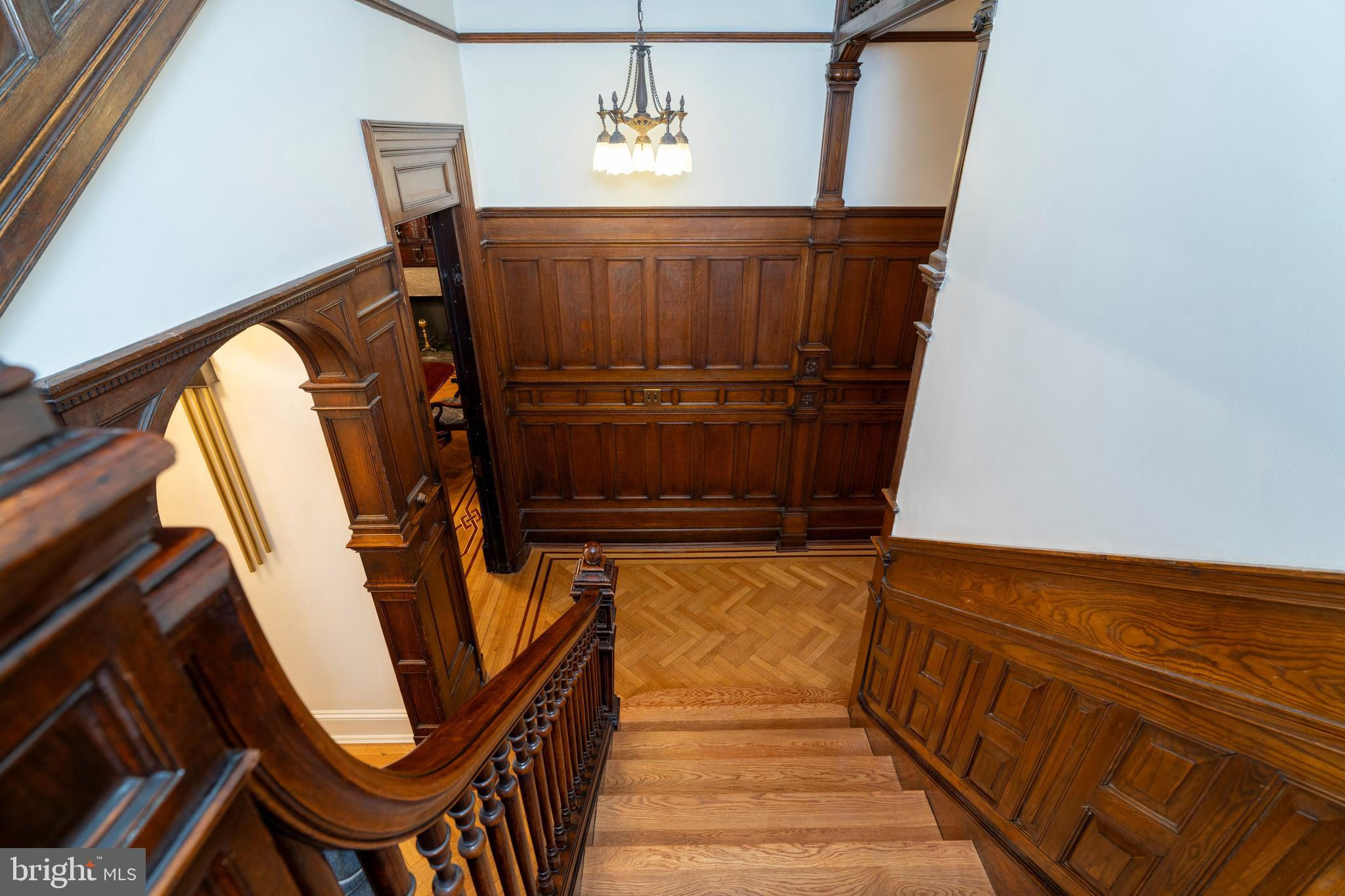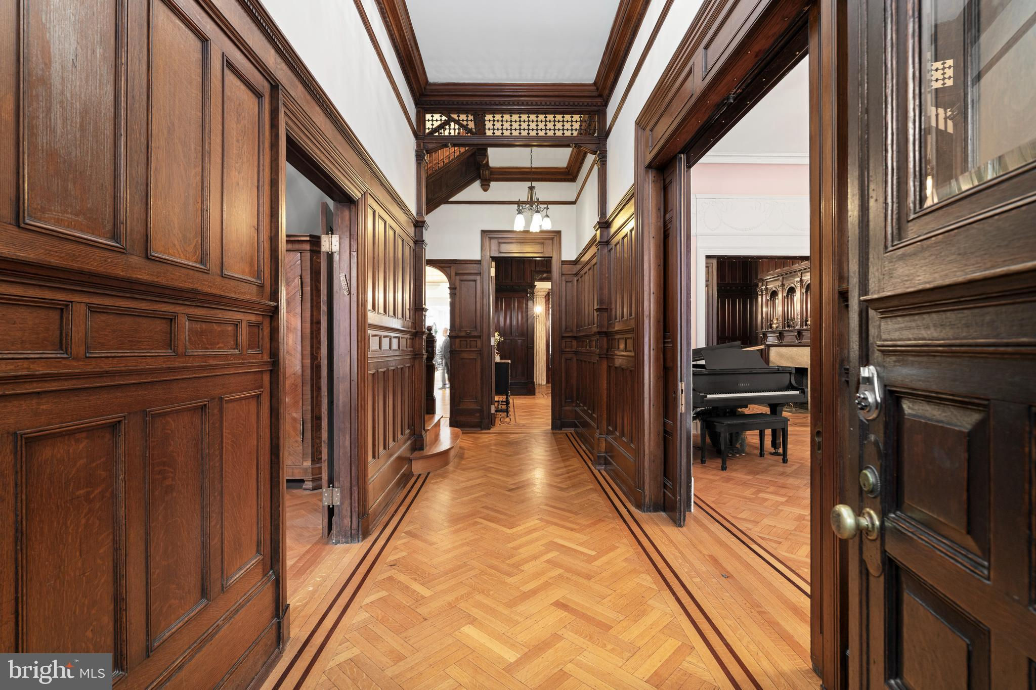 Historic Mansion in Mount Vernon, Baltimore: A Gilded Age Masterpiece Nestled in the heart of Baltimore’s esteemed Mount Vernon neighborhood, this meticulously restored 6,900+ sq. ft. brownstone offers a rare blend of historic grandeur and modern luxury. Originally constructed in the 1880s, the residence was home at the turn of the century to the Knabe family, renowned piano makers who expanded the house in a way that reflected their social standing and suited their penchant for throwing parties that regularly made the society pages. This spectacular home boasts six bedrooms with three full and two half bathrooms, ensuring ample space for family and guests, and an elevator for easy access to all floors. A short walk to Penn Station, for easy and efficient commuting access to Washington, D.C., Philadelphia and New York. Some of the home’s many features are: Gourmet Kitchen: Designed for the culinary enthusiast, the kitchen is equipped with Thermador appliances (including 6-burner range and counter-depth refrigerator/freezer), matte quartzite countertops, mother-of-pearl backsplash and pale blue cabinetry, along with table space and a wet bar with wine fridge, dark cabinetry and a dazzling white quartzite countertop. Great Room: The former conservatory is a breathtaking highlight, featuring 10 solid Italian marble columns, a milk-glass ceiling and intricately carved plaster and woodwork. Formal Living Room: With ornate plasterwork and a stunning chandelier, the large living room provides a sophisticated setting for entertaining. Dining Room: The walls and coffered ceiling of the 500+ sq. ft. dining room are paneled in old-growth mahogany, lovingly restored. The room also features quarter sawn white oak parquet flooring with walnut and maple inlays and a grand fireplace. Primary Suite: The expansive primary bedroom on the second floor has a spa-like en-suite bathroom, featuring dual vanities, a freestanding Kohler BubbleMassageTM tub, and a spacious zero-entry shower with contemporary tilework; completing the suite is a large sitting room (or additional bedroom). Third Level: Four large bedrooms and two full baths (one en-suite). Additional Spaces: Two beautiful, spacious offices, one on the first floor and one on the second (the latter also suitable for a nursery). in the attic and the huge basement, which also houses a large workshop and a workout room. Architectural Details: In addition to the gorgeous woodwork throughout, the home has a beautifully restored brownstone-and-brick façade. The interior retains a number of historic leaded glass windows, an ornate stained glass skylight above the staircase, and 11 fireplaces, many surrounded by original antique tiles. Outdoor Amenities: Beneath the house is a garage for up to two cars. At the rear of the house is a walled courtyard with a garden that includes an espalier apple tree, a weeping cherry, and hydrangeas, and room for additional parking for four cars. A spacious deck off the great room, shaded by a majestic magnolia tree, is ideal for entertaining. Modern Comforts: The home is equipped with multiple HVAC systems, providing year-round comfort on every floor and in every room, and there is a laundry room on the second floor. For a more immersive experience and additional information, please visit Knabehouse on the web, where you can explore videos and learn more about this extraordinary property. This home offers a unique opportunity to own a piece of Baltimore’s fascinating history, updated with modern amenities for contemporary living.